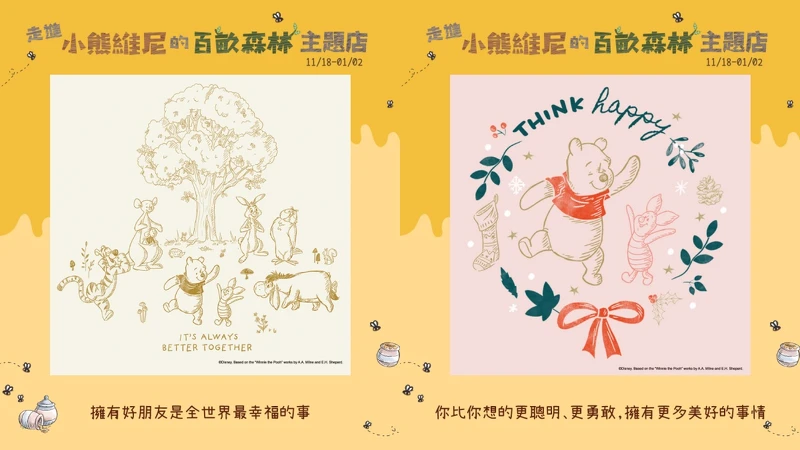 活動內容:凡於活動期間內於主題店不限金額消費,即可獲得QR code,週週推出不同款式祝福小卡,12月更有聖誕節款式,粉絲記得要收齊!下載小卡後,記得於個人FB公開分享且寫上指定hashtag「#走進小熊維尼的百畝森林」,按讚且標記Disney Style TW及Miravivi粉絲專頁,即可再抽小熊維尼系列限定禮!
