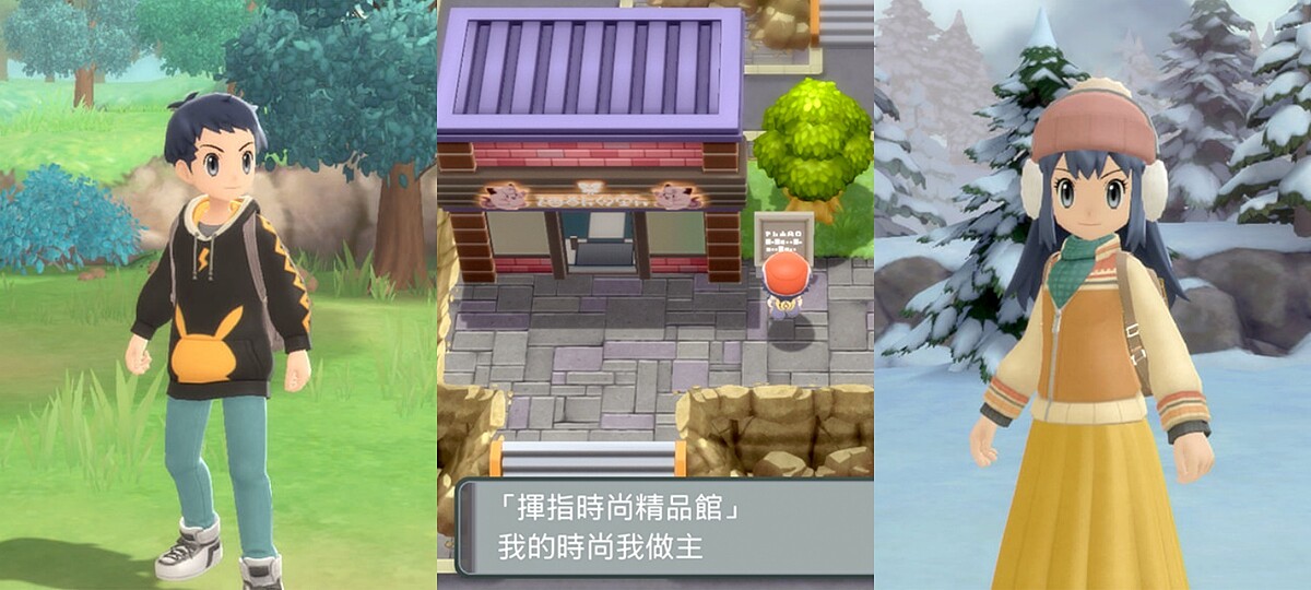 有別以往一套衣服穿到破關的模式,這次在《寶可夢晶燦鑽石》與《寶可夢明亮珍珠》中,主角可以在時裝店購買喜愛的服裝,也可以更改主角的髮型,一整套的搭配,讓大家可以穿上喜愛的服裝盡情享受神奧地區的冒險之旅!