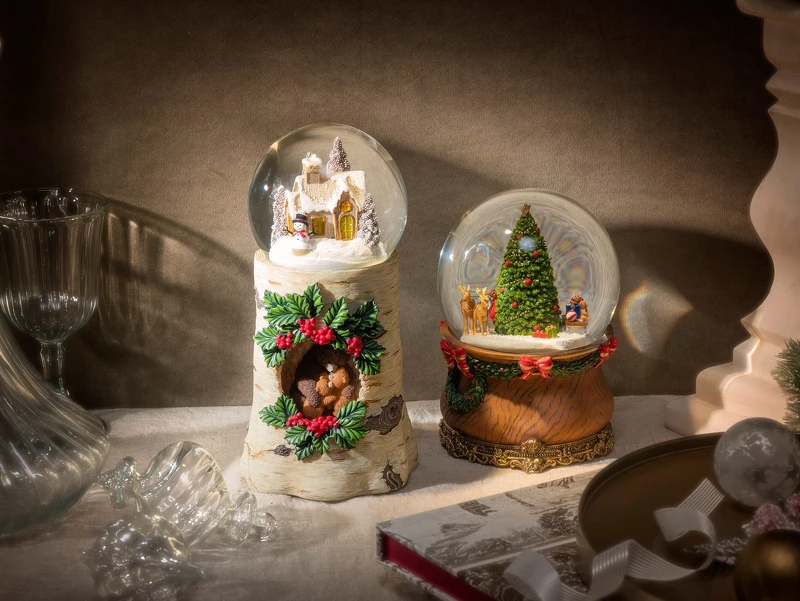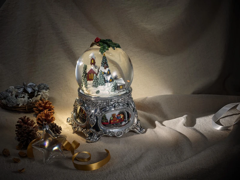 對於聖誕節馬上就能聯想駕著雪橇的聖誕老人,與掛滿燈飾蓋著白雪的聖誕樹,是從小大到對聖誕節的美好回憶。聖誕節花環圍繞在音樂盒木紋底座上,用亮眼紅色蝴蝶結活潑點綴著,當輕快響亮的聖誕鈴聲響起時,水晶球內自動飄起雪花,幻想的聖誕國度也跟著起舞旋轉,場景純粹卻是無與倫比的美麗,就像一直佇在我們內心裡,最單純美好的秘密世界!