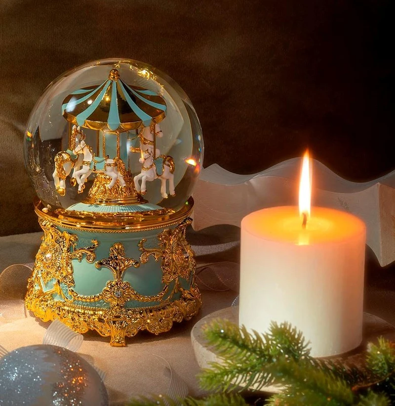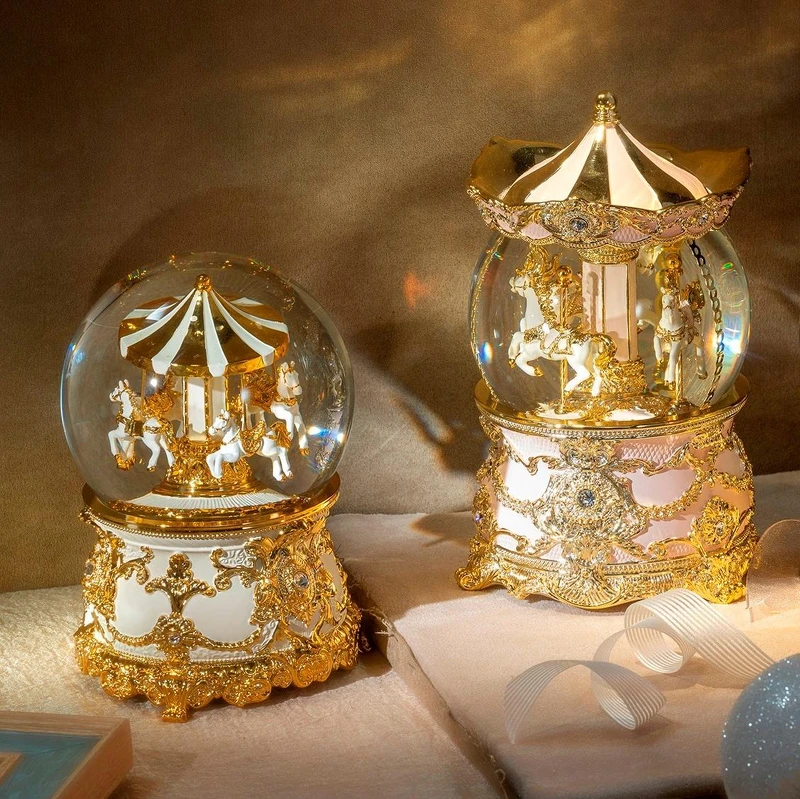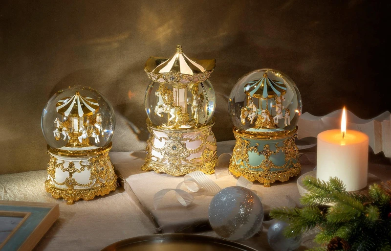 為居家氣氛點綴精緻高級感,以金色系主題打造的水晶球能一舉提升生活質感,也絲毫不顯土豪般的鋪張感。音樂盒身上滿是巴洛克華麗風格精細雕刻工藝,透過匠人手感溫度完成設計構圖、雕刻成形到繪製上色,每一處的細膩都是構成藝術品的因素。金黃旋轉木馬跟著亮片雨自動旋轉,起舞的每個瞬間都讓人盯得目不轉睛,深深被吸引。