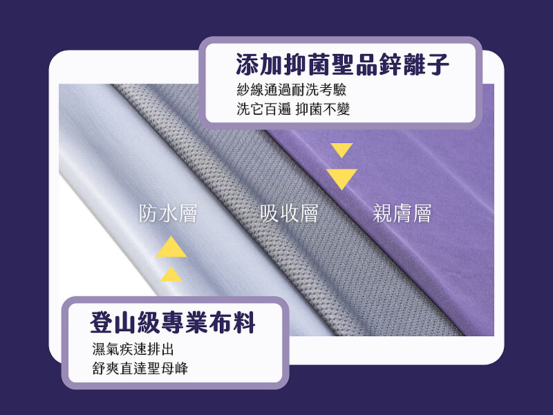 底部三層結構設計,透過嚴選台灣本地優質輕薄機能布料,一層層提供防水透氣、抑菌、減少異味、瞬吸滲透的優秀吸收力…等貼心防護。
