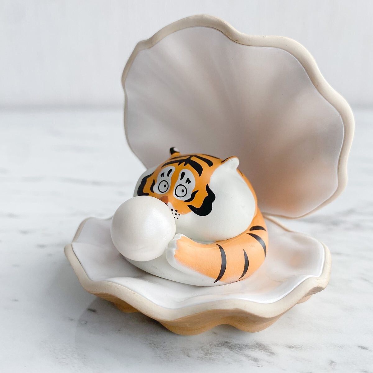 蚌殼的紋路與顏色非常細緻,裡面還躲著一隻療癒萌虎,手裡還捧著圓滾滾的珍珠,真的太萌了!