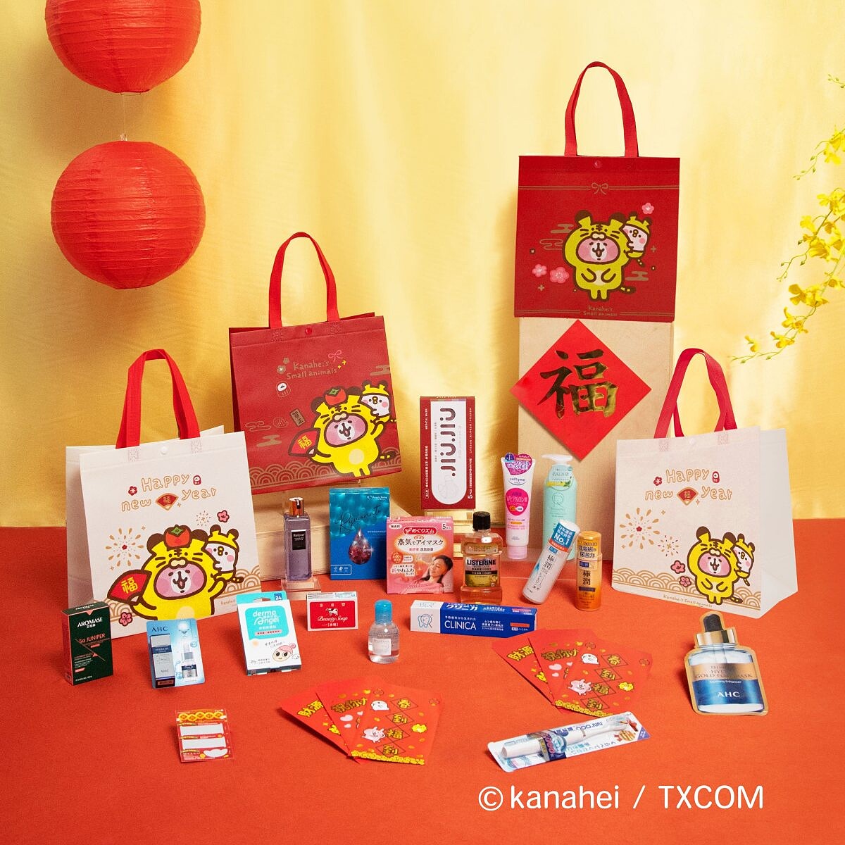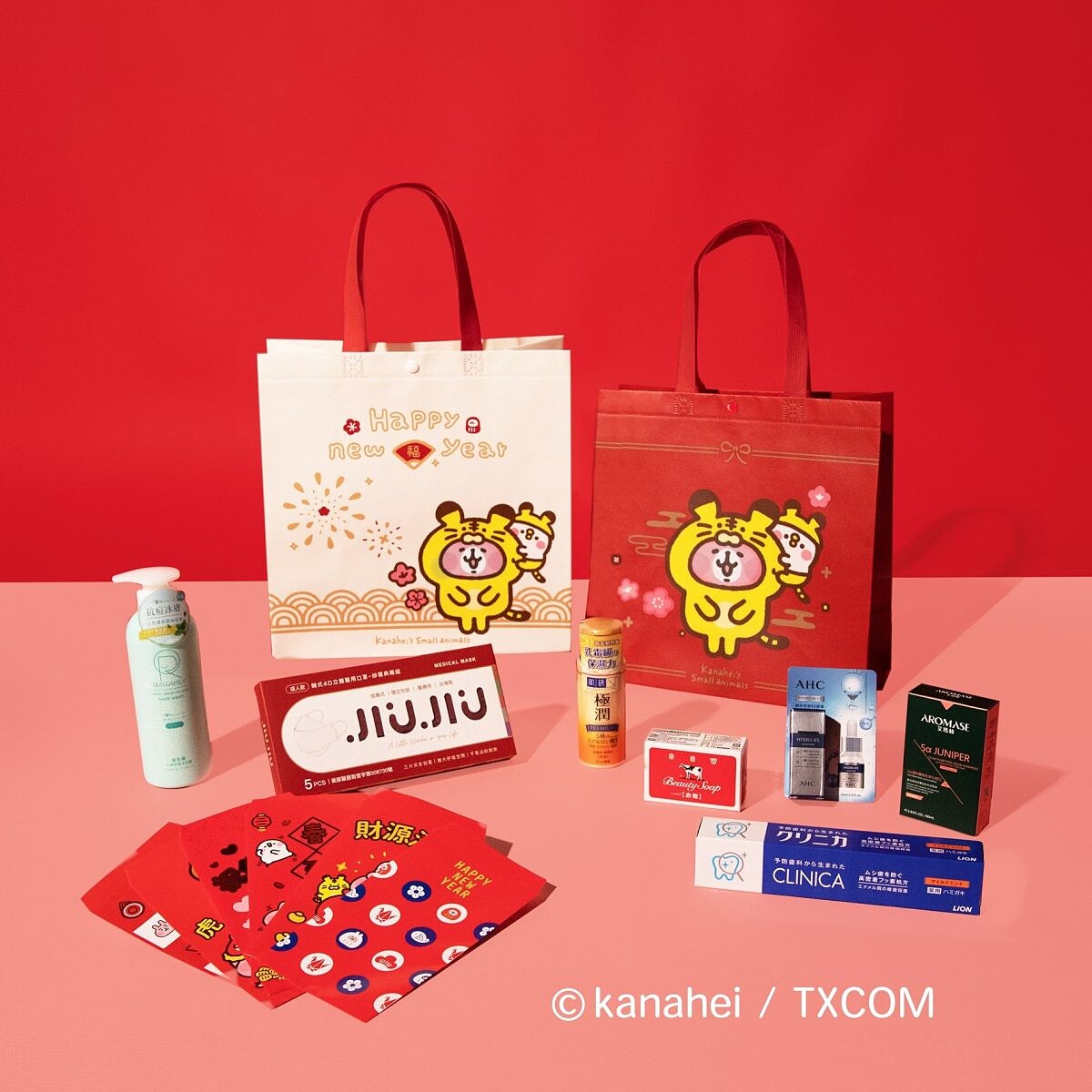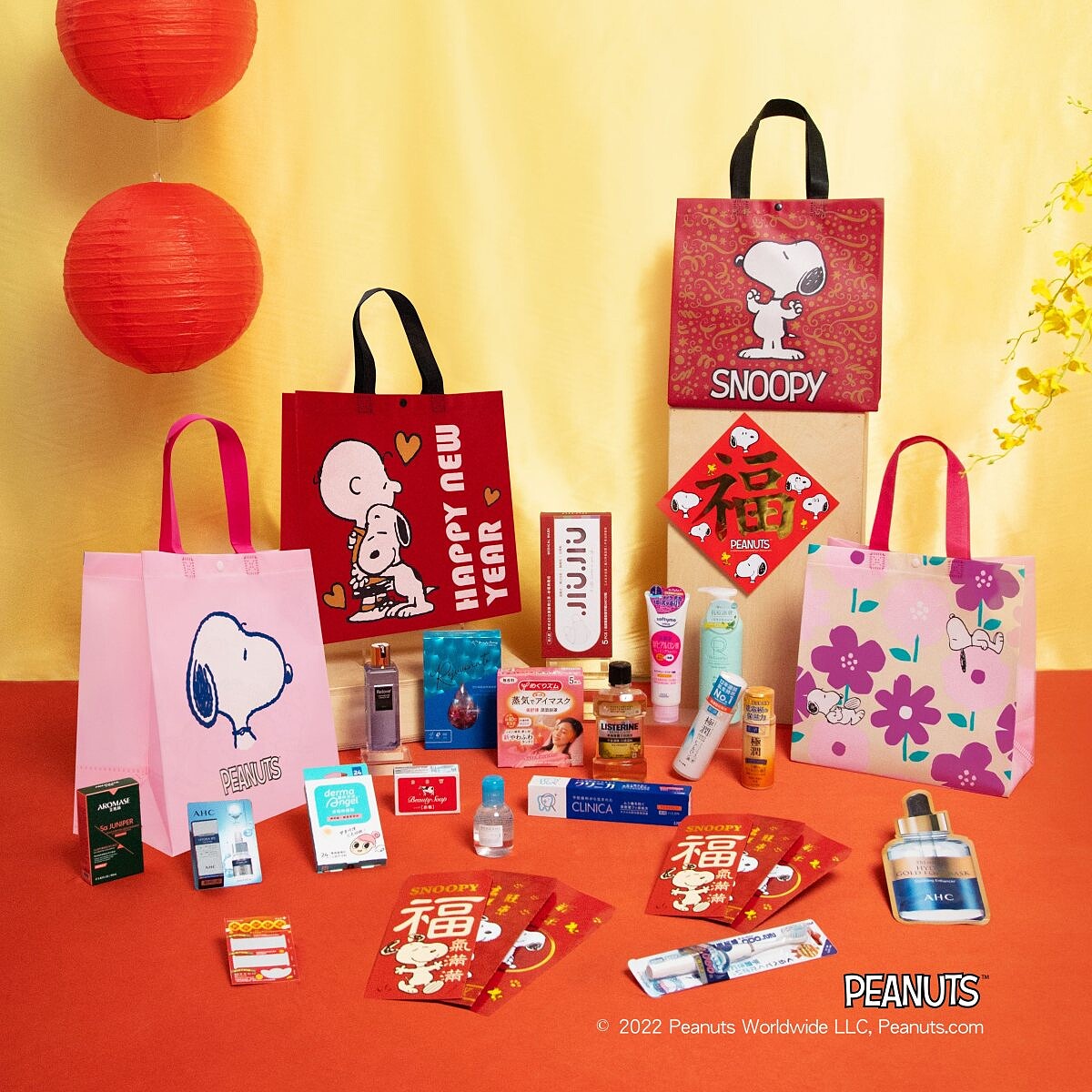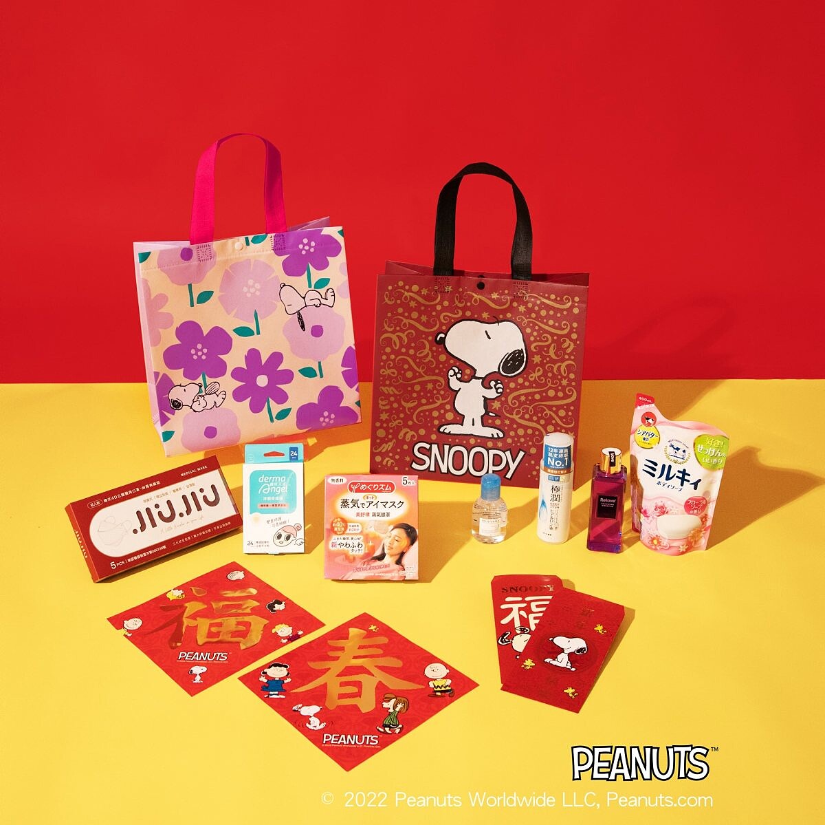 康是美新春福袋外包裝採用超人氣兩大IP角色,SNOOPY史努比、卡娜赫拉的小動物,共同推出4款新春福袋,福袋內c會隨機附贈4款商品、1款紅包組合與1張刮刮卡,隨機商品包含韓式4D立體口罩5入、化粧水、精華乳、面膜、精華液、蒸氣眼罩與日用品等。