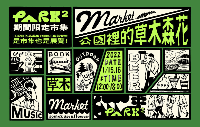 2021年曾登上漁光島,舉辦藝術質感市集的「草木森花之市」團隊,由台南甜點店「草木」擔任總策畫,2022年第一場活動就走出台南,與 PARK2 合作舉辦限定兩日的「公園裡的草木森花」市集,主視覺更與台中文化代表品牌:本冊圖書館 Artqpie Library 合作,使用獨特的插畫的風格,描繪出「公園裡的草木森花市集」的個性與質感,讓人倍感期待大人系公園 PARK2 裡的漫步、購物,享受不同漁光島風格的草木森花市集。