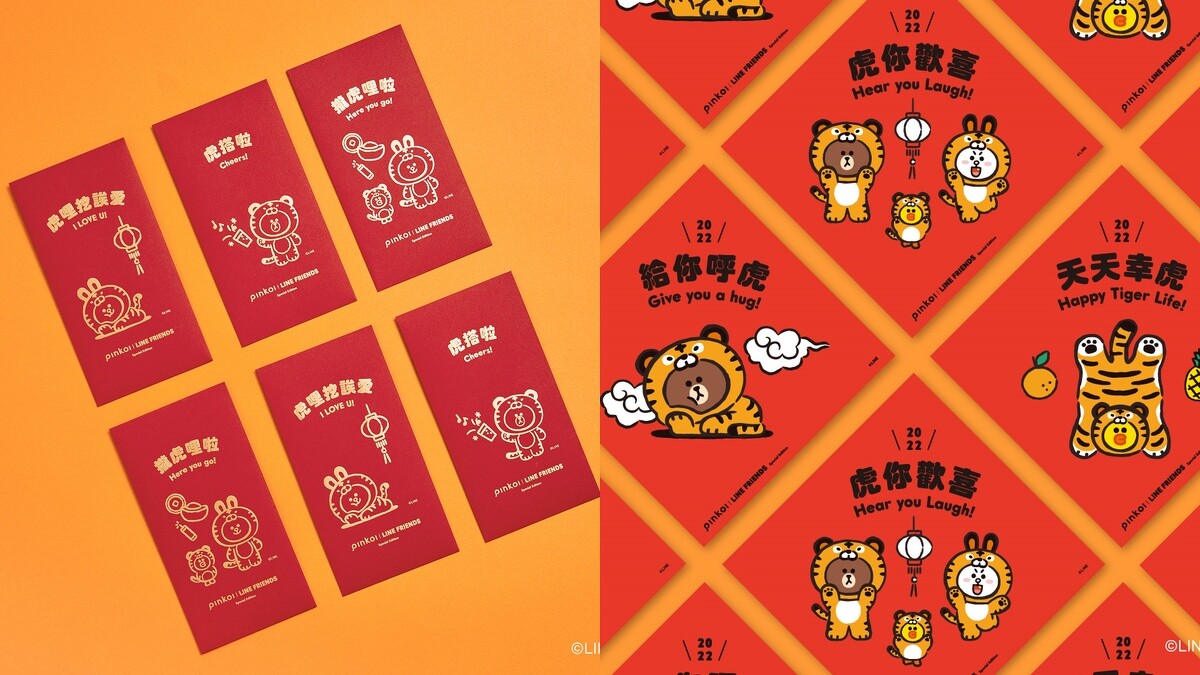 繼2021年底雙方聯名推出一系列超可愛生活小物後,在春節前夕再次推出極具年味的紅包袋款式。上面印著穿上老虎裝的熊大燙金圖案,更寫著「攏虎哩拉」、「虎哩挖誒愛」、「虎搭拉」的諧音字,傳遞送禮者的滿滿心意。另外還有三款台味限定徽章,以及一個1/25才會釋出的隱藏款,鐵粉們絕對要收集。