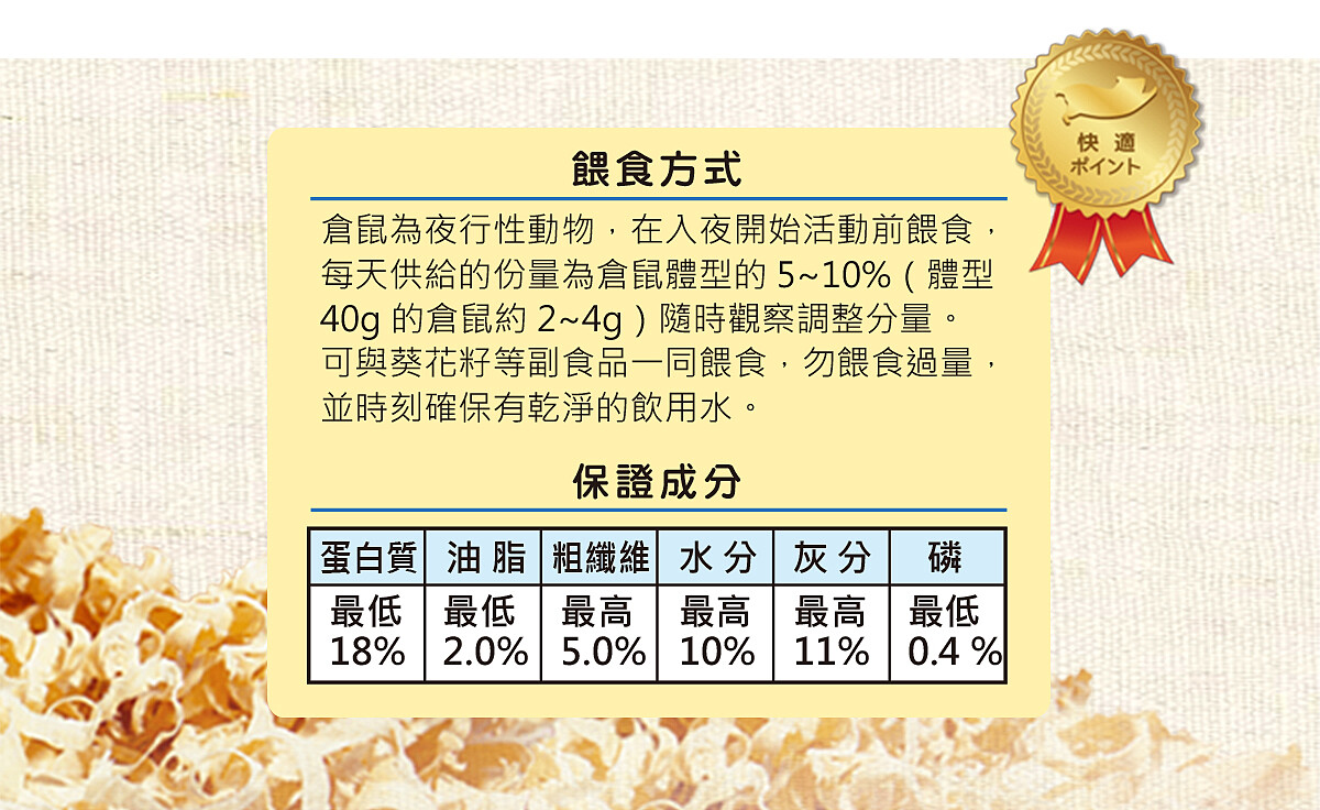 依據倉鼠的營養需求,以黃金比例混合動物性及植物性蛋白質,其中更包含大量菸鹼酸來源的重要氨基酸,補充倉鼠容易出現的維生素不足問題。