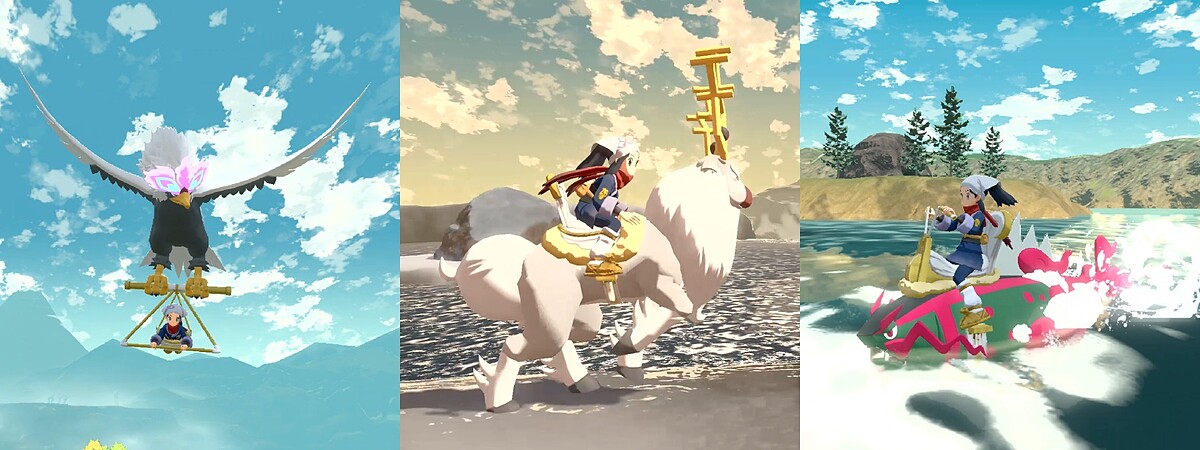最讓人驚喜的是還可以通過騎乘寶可夢在大地馳騁,也可以在水上和天空上移動,甚至能從陸地秒切換到水上,或是飛上天空,讓大家更自在地在洗翠地區展開冒險!