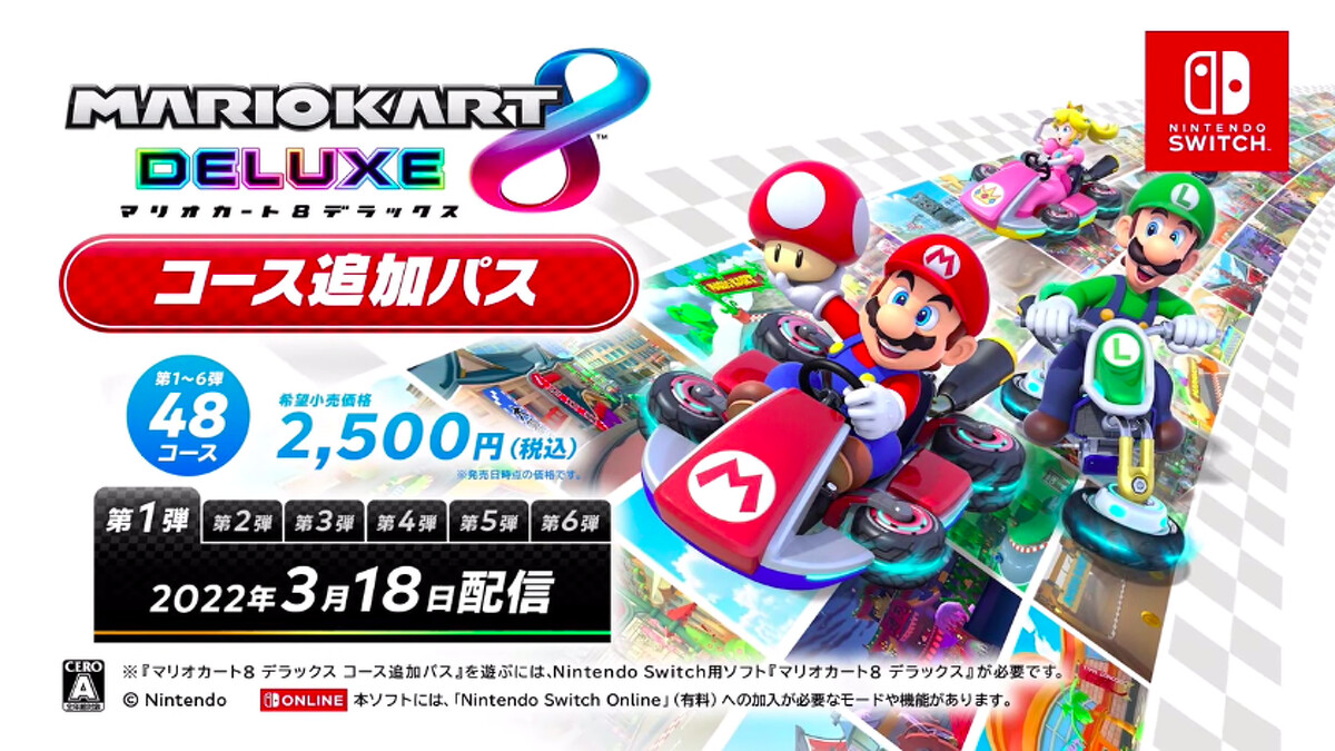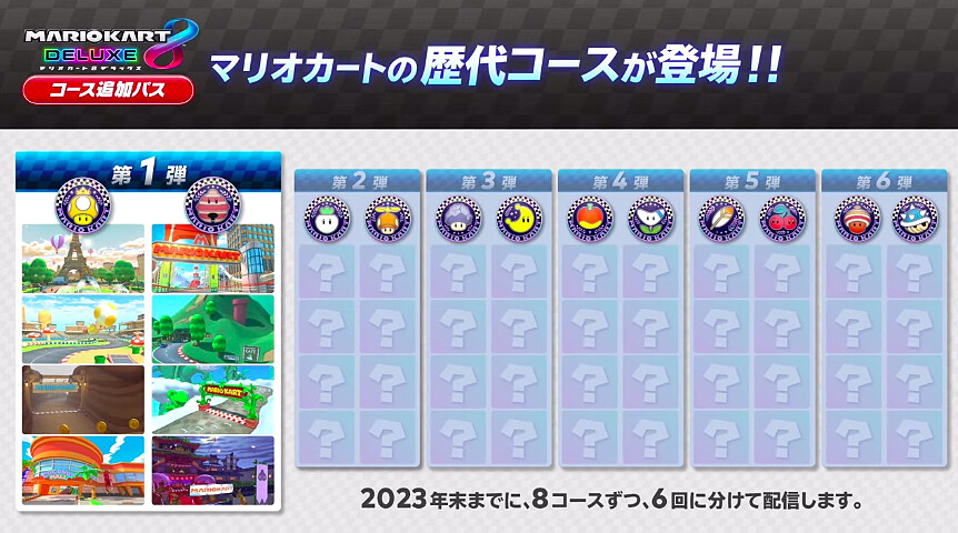 《瑪利歐賽車8 豪華版 新增賽道通行證》付費DLC將推出6彈,一共有48種歷代經典賽道,像是Tour 巴黎兜風、Tour 東京賽道、Tour 忍者道場等等!