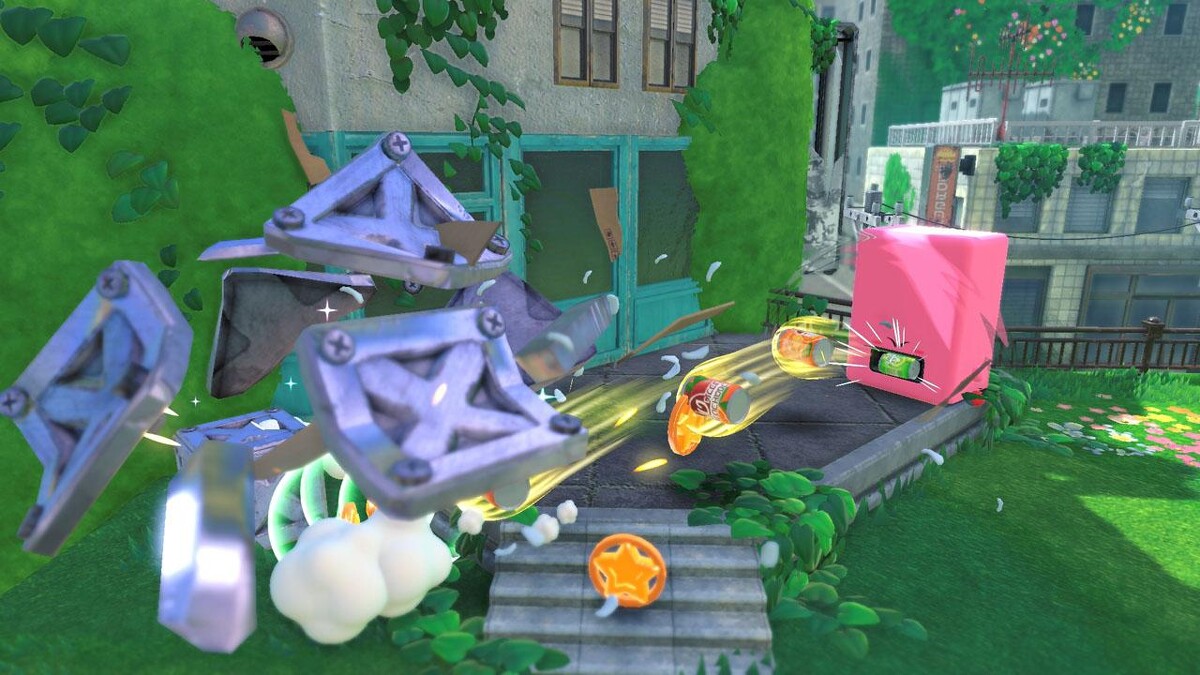 然後一秒變卡比汽車,還可以變成飲料機,丟出飲料罐對敵人發動攻擊!