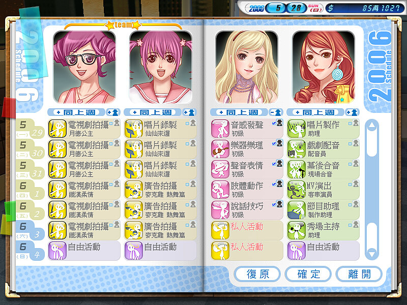 遊戲中有18位各自擁天賦專長的男女藝人,玩家可以自由選擇培育訓練,以培養天王、天后等級巨星為目標,逐漸擴大演藝圈的事業版圖!