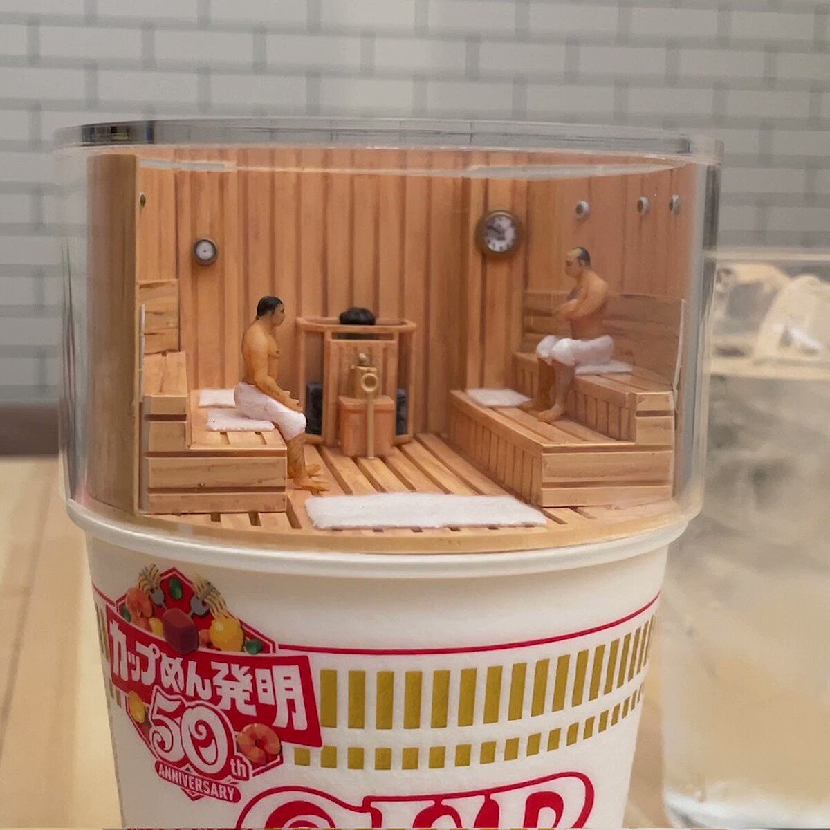 看著泡麵的熱氣緩緩上升,而桑拿房也逐漸被熱氣包圍,整個場景完全就是真實的三溫暖無誤,會讓人忍不住一直想加熱水,想讓他們繼續蒸桑拿!感覺做成澡堂或是溫泉的場景也很合理,不過這款三溫暖泡麵蓋目前沒有販售,這麼幽默的設計,小編真的好想要擁有啊!