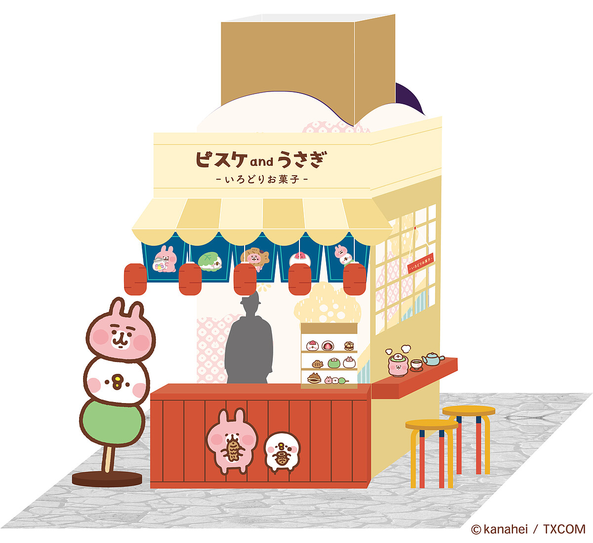 一秒置身日本!期間限定店內以繽紛糖果為主題設計,更特地打造了「日式和菓子屋」,讓大家化身P助與粉紅兔兔和菓子店店長一起叫賣,現場還有超過1.5米高的P助與粉紅兔兔日式糰子串,怎麼拍都超可愛!