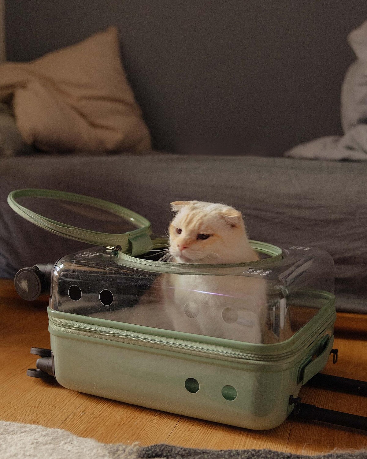 CROWN這次首度打造的「透明拉鍊寵物箱」,透明箱體如泡泡般又美又夢幻,能夠隨時關注寵物情況,拉鍊圓形箱蓋也方便餵食和抱出寵物,上方更有掛環可以佩掛毛小孩的用品。