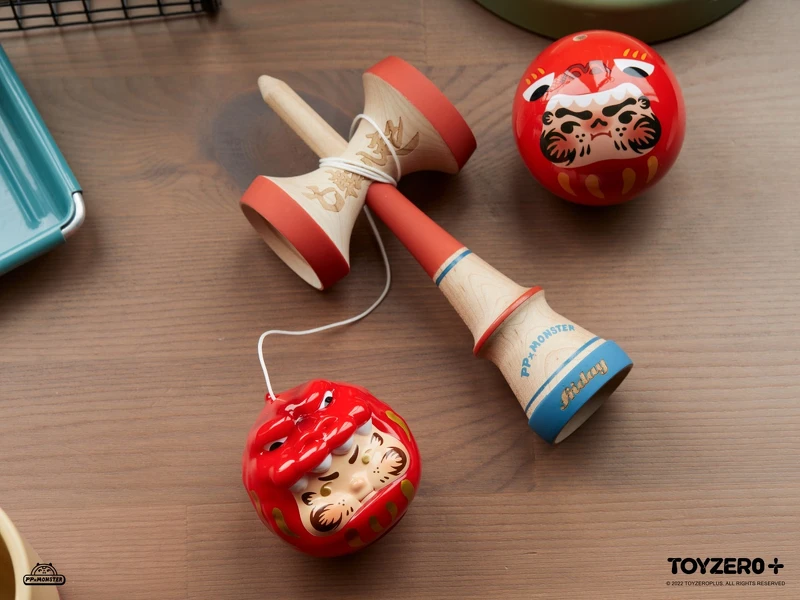 一套「PP X MONSTER達摩劍球」共有兩個可替換劍球,立體的達摩PP BABY劍球有著達摩「七転八起」的寓意,象徵不畏困難,勇於挑戰。大家也可換上另一枚圓形木劍球,體驗傳統劍球的樂趣!
