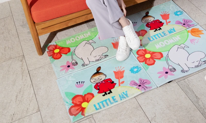 嚕嚕米地墊是法蘭絨材質,觸感舒適。背面還有魔鬼氈設計,可依需求將兩片地墊上下或左右拼接,也可購買多組合併使用!