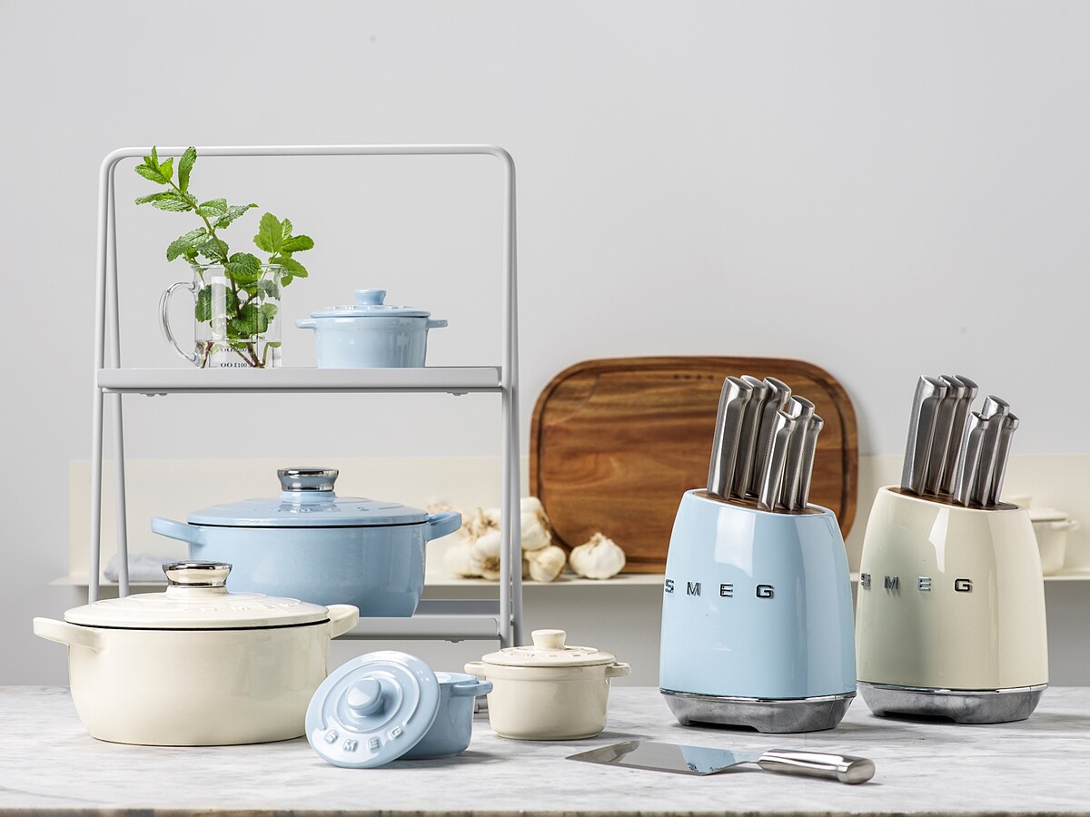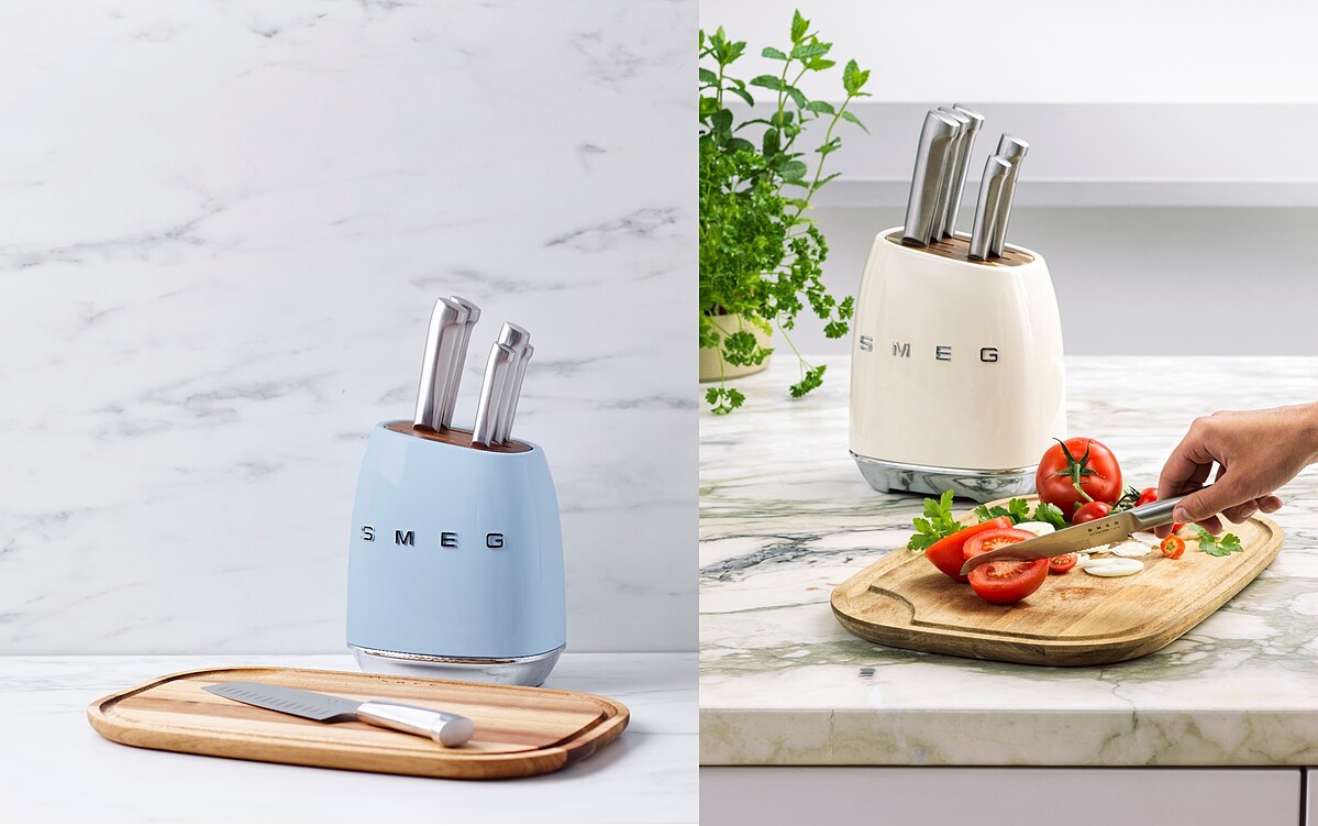 為了讓廚房餐桌可以呼應SMEG刀具與鍋具的視覺完整度,復古設計、座身外層以粉體塗裝碳鋼的六槽相思木刀架,同樣也有粉藍與奶油兩色,方便收納換購回家的刀具,讓廚房空間美感更上一層樓。