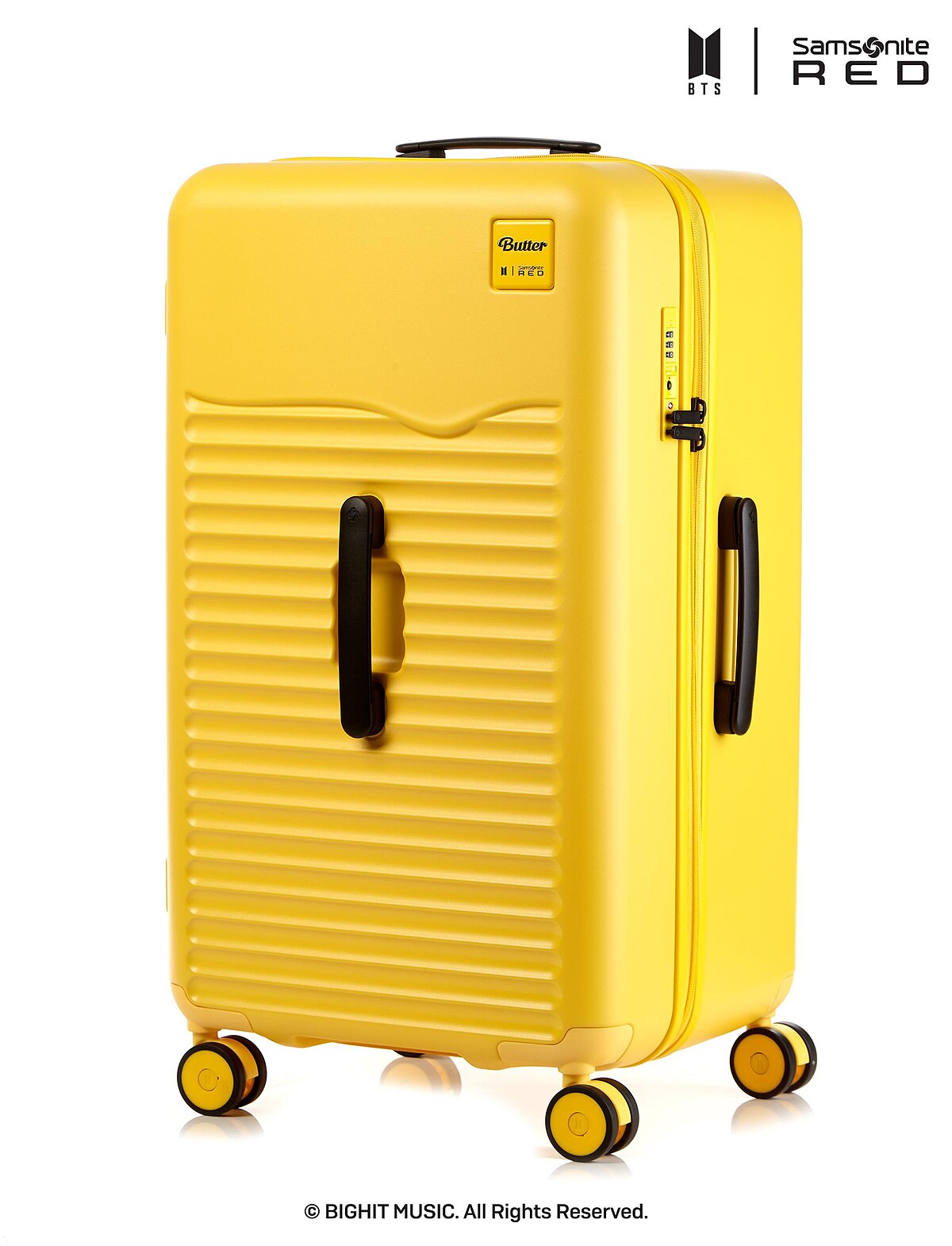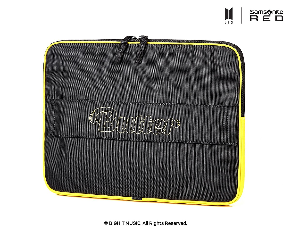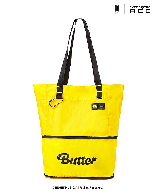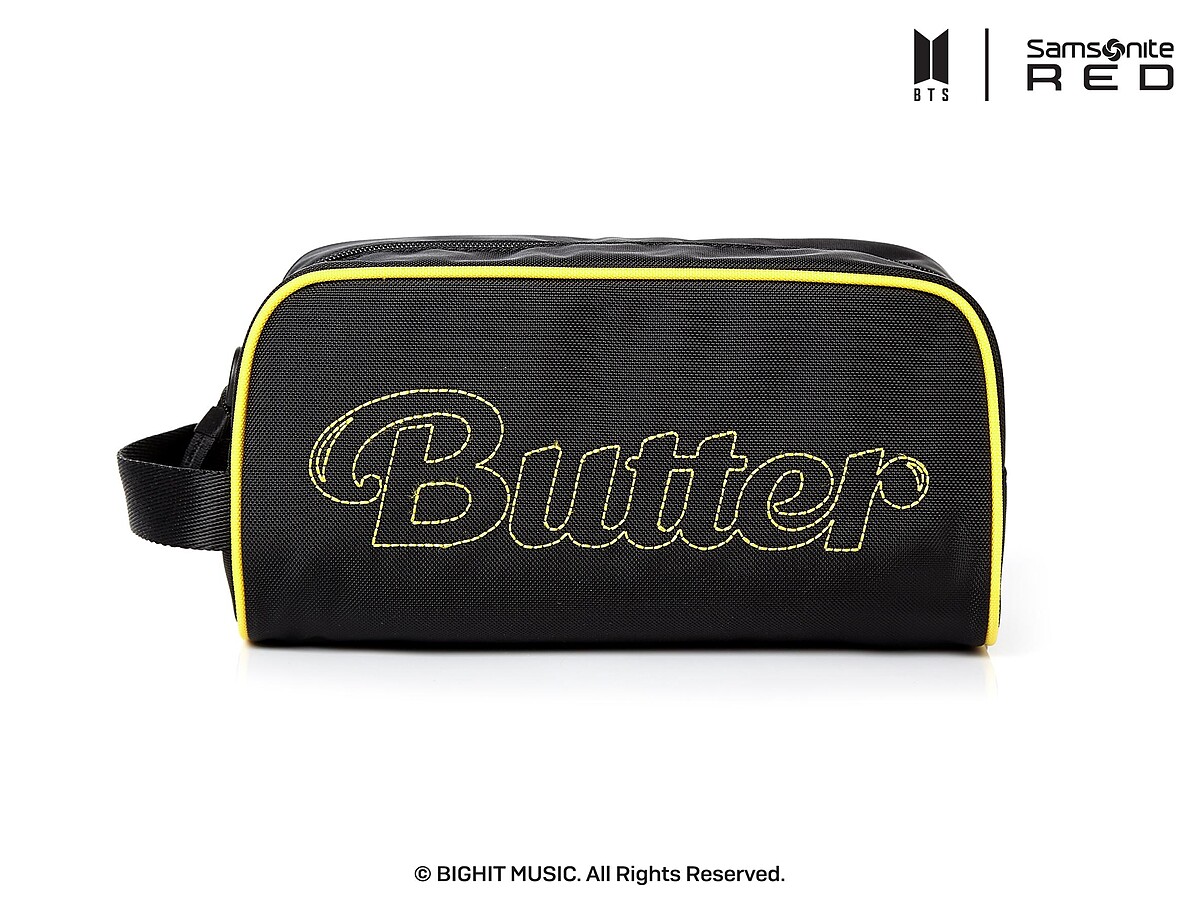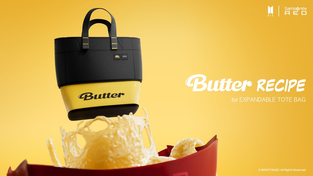 繼上回的Dynamite系列後,Samsonite RED今年以BTS人氣歌曲〈Butter〉為靈感,推出全新奶油黃15款商品,最吸睛的莫過於兩款行李箱,採用融化的黃色奶油為意象設計,在每個行李箱輪蓋上皆有配置了代表歌曲〈Butter〉的印刷圖形圖案,以及附贈DIY客製套件,讓阿米們隨心打造。