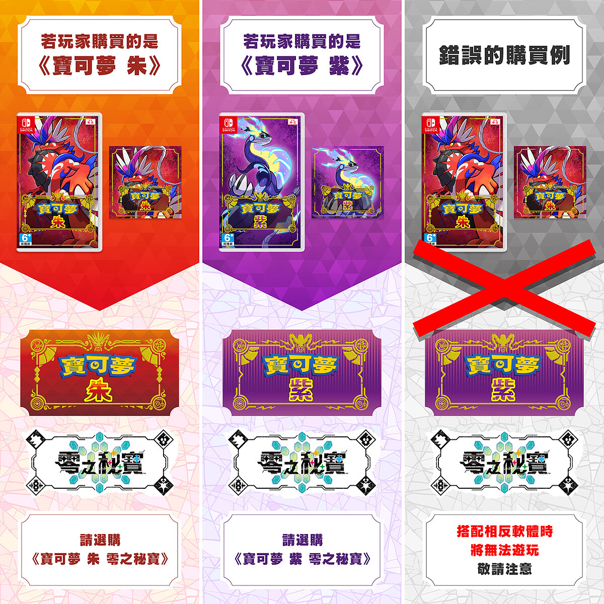 若玩家持有的是《寶可夢 朱》,請購買《寶可夢 朱 零之秘寶》。若玩家持有的是《寶可夢 紫》,請購買《寶可夢 紫 零之秘寶》。搭配相反軟體時將無法遊玩,請大家購買前務必確認遊玩的版本,避免陷入買了卻無法玩的窘境!