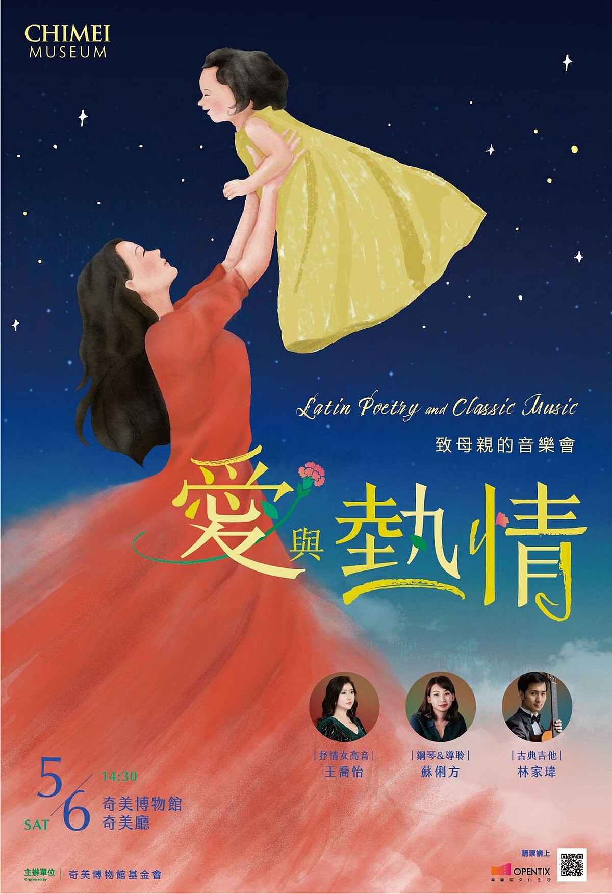 除了有全新規劃的親子音樂會,奇美博物館經典節目──母親節音樂會,今年主題為「愛與熱情」,以風格強烈的拉丁曲目傳遞母親優雅浪漫和熱情豐沛的不同情感。並由活躍於舞台的聲樂家王喬怡、鋼琴家蘇俐方,以及被譽為「天才古典吉他演奏家」的林家瑋共同演出。