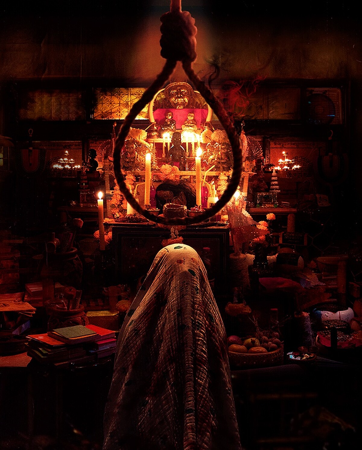 除了可以看到《粽邪》身穿白紗、鬼新娘上吊懸掛在高空中,360度零死角,讓送煞人一睹上吊者的恐懼,千萬記得不要和祂對到眼。
