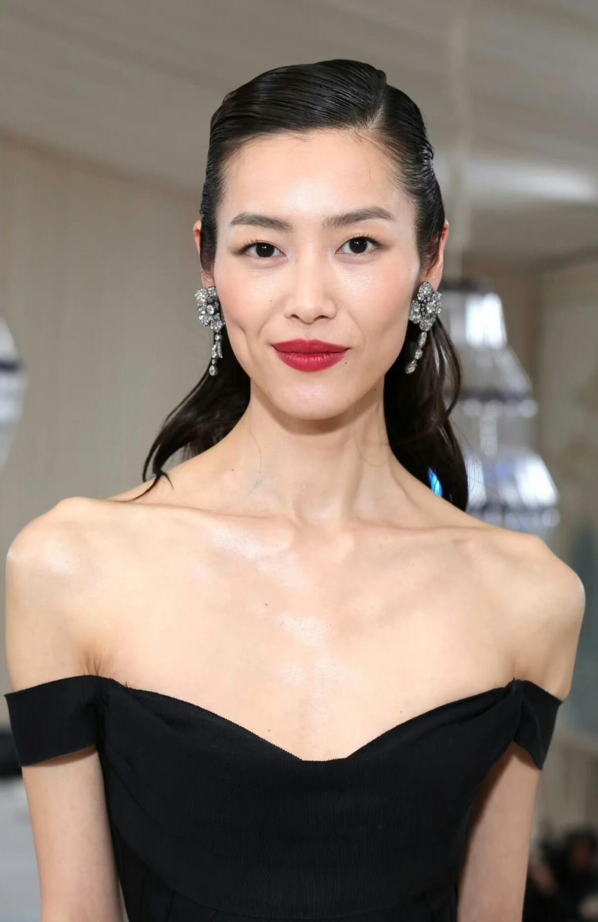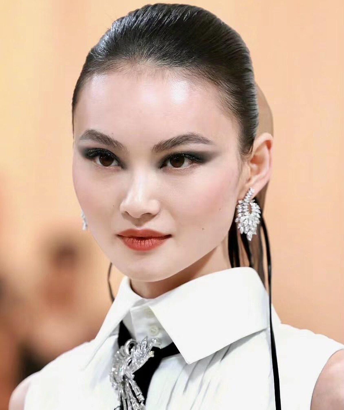 劉雯身穿Tory Burch禮服,禮服整體偏向1950年代風格。妝容的設計上Jonathan呈現50年代加現代的風格,眼妝以小煙燻為出發點,用灰棕色的眼線筆打底,非常小範圍暈染(位置稍微超過他原本雙眼皮一點),疊擦香奈兒灰色霧面眼影呈現自然煙燻,並且將眼影往後延伸,增加眼型細長感,不想要過度搶眼搶過服裝。