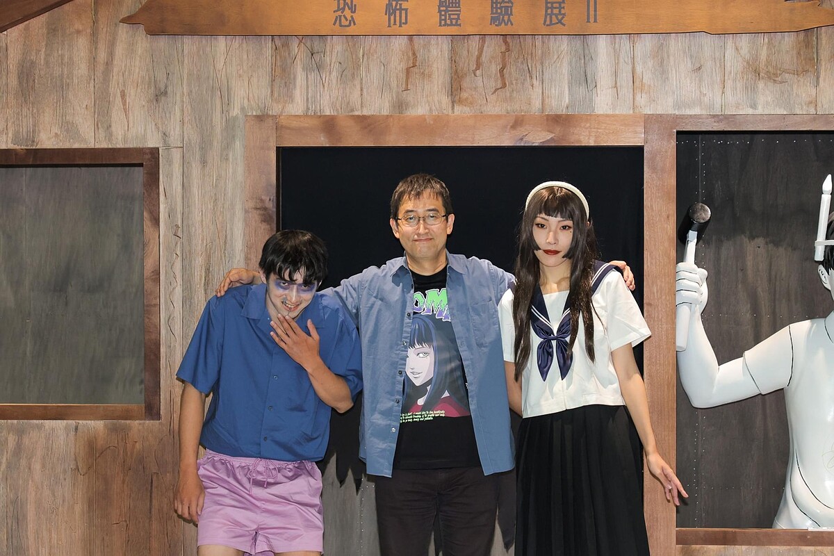 日前伊藤潤二老師特別從日本來台,除了驚喜現身記者會,更與20位粉絲們一同挑戰「償命村」「喚惡鎮」的顫慄體驗。逛展時老師也被演員的逼真演技嚇到忍不住驚叫出聲!