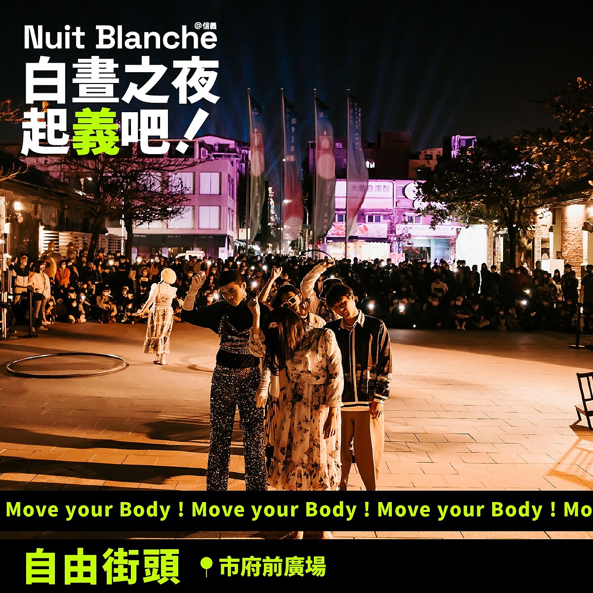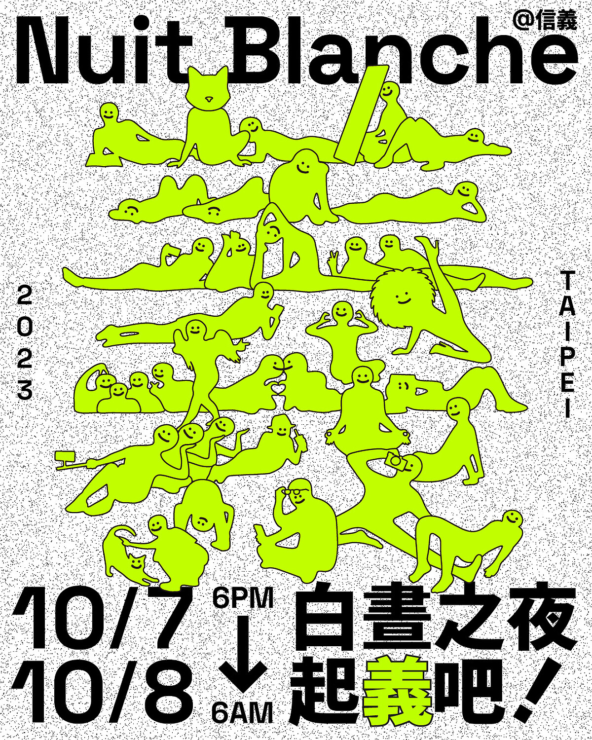 源自2002年法國巴黎的「白晝之夜」,在全球多處舉辦兼具「跨夜舉辦」、「免費參加」及「公民參與」等三大特色的夜間城市藝術節。台北自2016年開始響應加入,至今也來到第八屆,2023年主題為「起義吧」,地點落在「信義區」,藝術作品規劃在國父紀念館、臺北市議會、臺北市政府等3大場館,另外還有松山文創園區、台北101、ATT 4 fun及許多場域共同響應,打造台北市中心最大的藝術廣場。