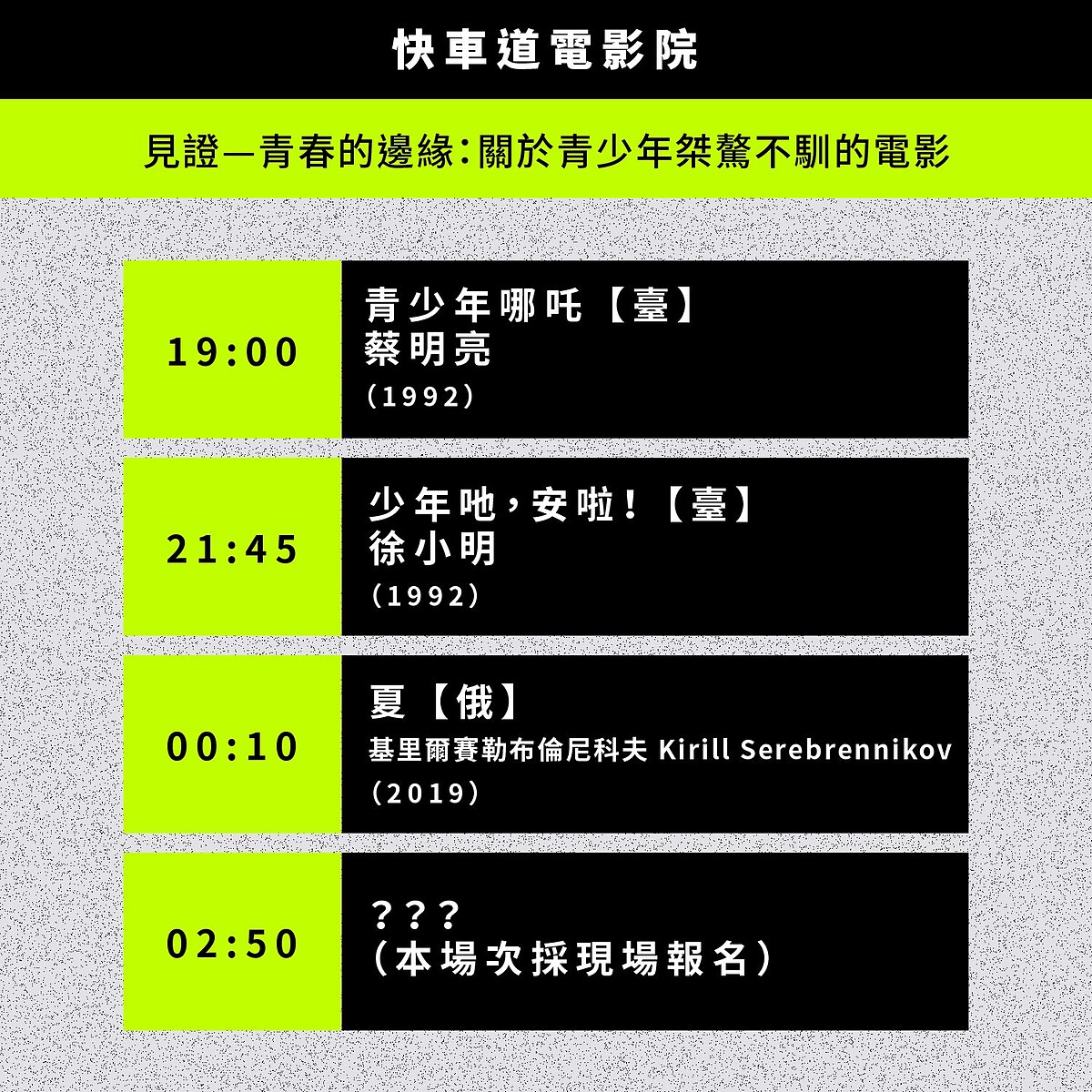 這次頗具噱頭的《快車道電影院》,將會在快車道旁的樹蔭下擺滿躺椅,並播放3部主題聚焦在「青少年桀驁不馴」的電影:蔡明亮《青少年哪吒》、徐小明《少年吔,安啦!》、夏 《俄》及一部尚未公佈的片單。另外在信義威秀影城17廳、18廳則會放映關於抗爭紀事、青春與台北的主題電影。