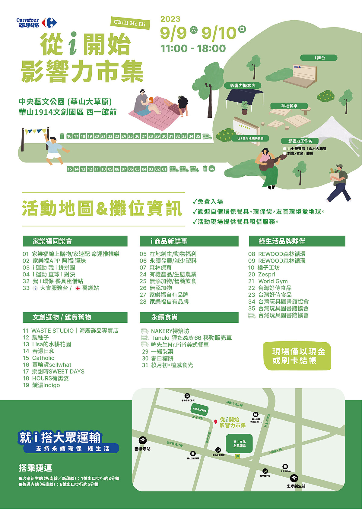 以i等於我,發揮自我影響力,「改變的力量從i開始」家樂福串聯共同消費意識的傳播網。每一次的消費每一次的行動,都能為永續的未來培植一株株的新幼苗,但如何施予養份發芽茁壯,就需要更多人實踐影響力。家樂福特別選在入秋前的首個週末假日9月9日~9月10日,展開一場規模最大寓教娛樂的「家樂福從i開始.影響力市集」,在假日與親朋好友共聚的時刻,以輕鬆暢遊樂園的心情,透過i市集體驗啟發心之所向對永續意識的抬頭,地點就在台北市區內文創代表中央藝文公園(華山大草原)華山1914文創園區西一館前舉辦,活動期間星期六、日從上午11:00~下午06:00,現場共分為:i舞台(故事劇場)、影響力概念店、草地餐桌、影響力工作坊、音樂展演5大區域,市集規劃出40個主題攤位,並歸類:家樂福同樂會、i商品新鮮事、文創選物/雜貨舊物、永續食尚、綠生活品牌夥伴。家樂福i市集全程免費入場。