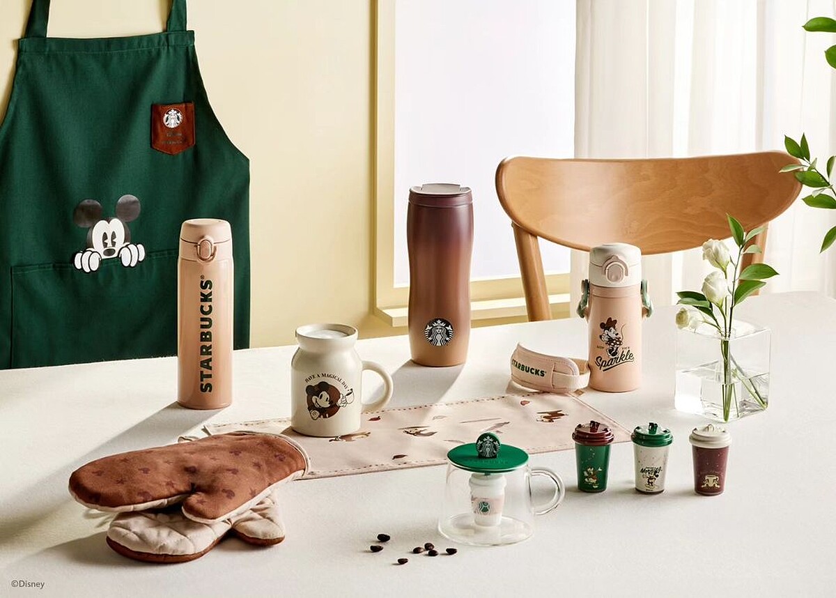 韓國星巴克搶先推出與迪士尼最新聯名,包括馬克杯、隨行杯、圍裙和烹飪手套等,通通印上米奇圖案,並採用復古感的綠色、咖啡色調,還推出聯名冷萃咖啡,上頭有米奇造型圖案點綴,根本讓人捨不得喝,聯名系列將於9月12日上市。