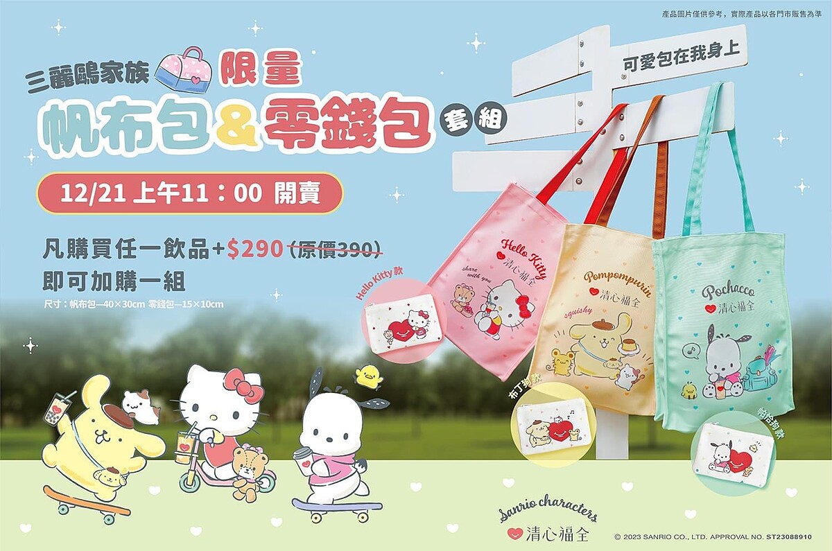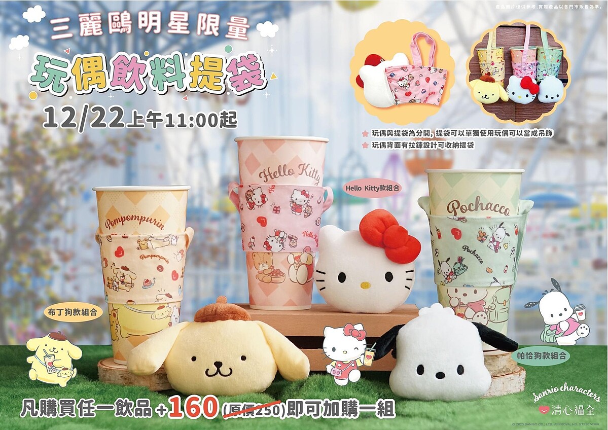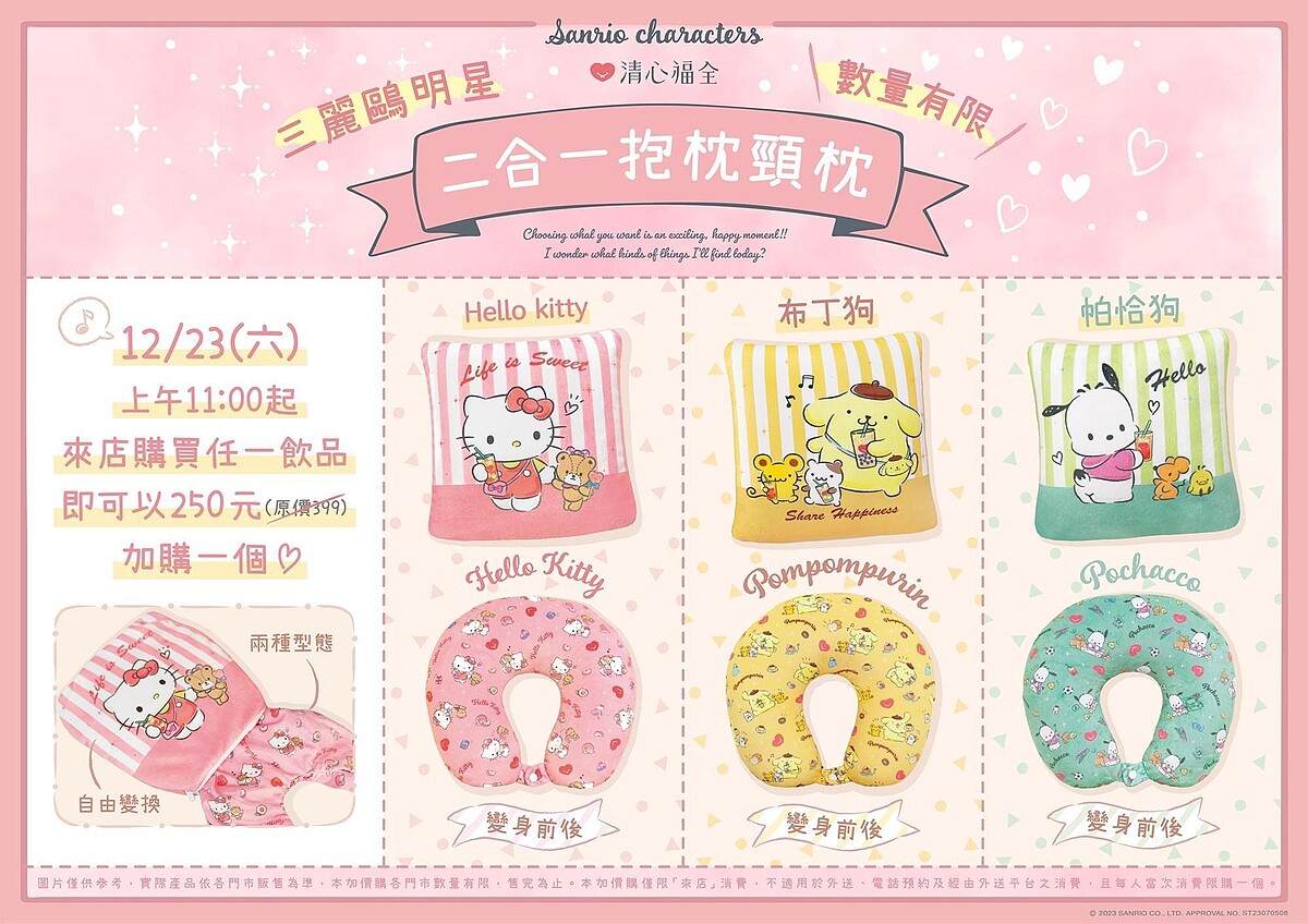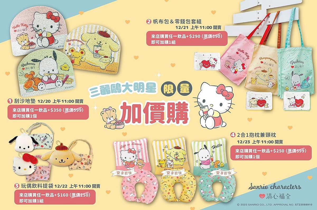 除了9款Hello Kitty、布丁狗、帕恰狗圖像紙杯,從11月1日起超萌出擊。清心福全首波推出極限量加價購,馬卡龍色系的「三麗鷗絲圈刮沙地墊」,採用環保PVC材質止滑耐磨、高彈絲圈經久耐用,讓大家輕輕鬆鬆把髒污風沙留外面。還有超萌生活小物「聯名恰好瓶2.0」、「玩偶飲料提袋」、「二合一抱枕兼頸枕」、「帆布包+小零錢包」以及「全彩金蔥貼紙」,粉絲們絕不能錯過。
