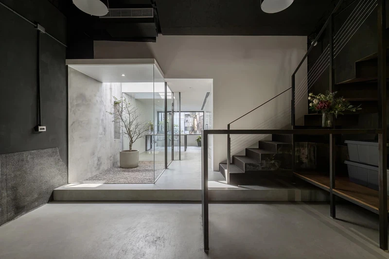 呼應「拾初」二字的精神,拾初建築完整保留建物原有的斜屋頂、夾層、磨石子地、磚牆等結構和建材,僅以最低限的手法重新整頓這幢超過六十年的老房子,另加入鐵件、玻璃等現代素材,以整齊俐落的線條與周遭斑駁陳舊的環境形成對比,並運用木質作為銜接新舊元素的中介媒材,使兩者順利且和諧地交融,為老屋帶來燦然一新的別緻面貌。