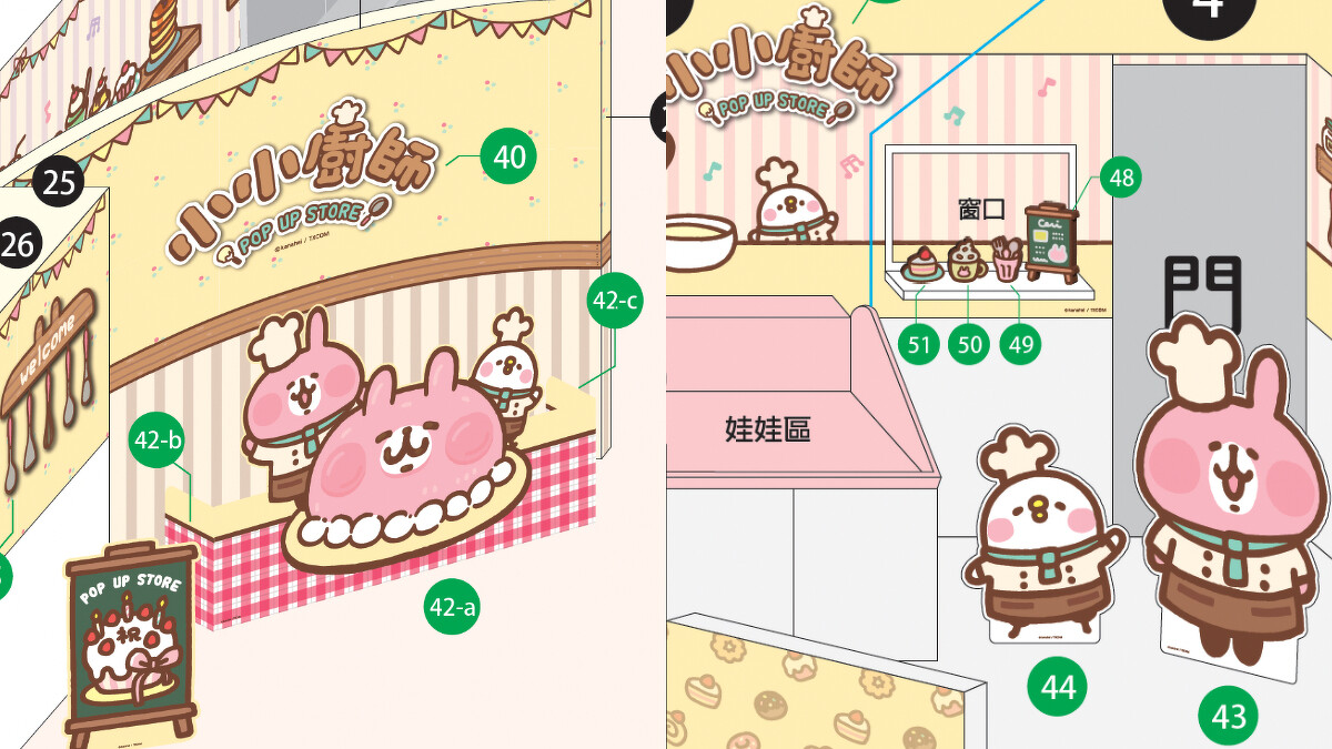 這次P助與粉紅兔兔化身為小小廚師,看他們在「小小廚師主題牆」拿著超大粉紅兔兔蛋糕迎接大家,還有粉紅兔兔在「翻轉吧鬆餅區」展現煎鬆餅絕技,以及P助與粉紅兔兔在「小廚師甜甜點點區」認真揉麵團的可愛模樣等6大打卡點不能錯過。