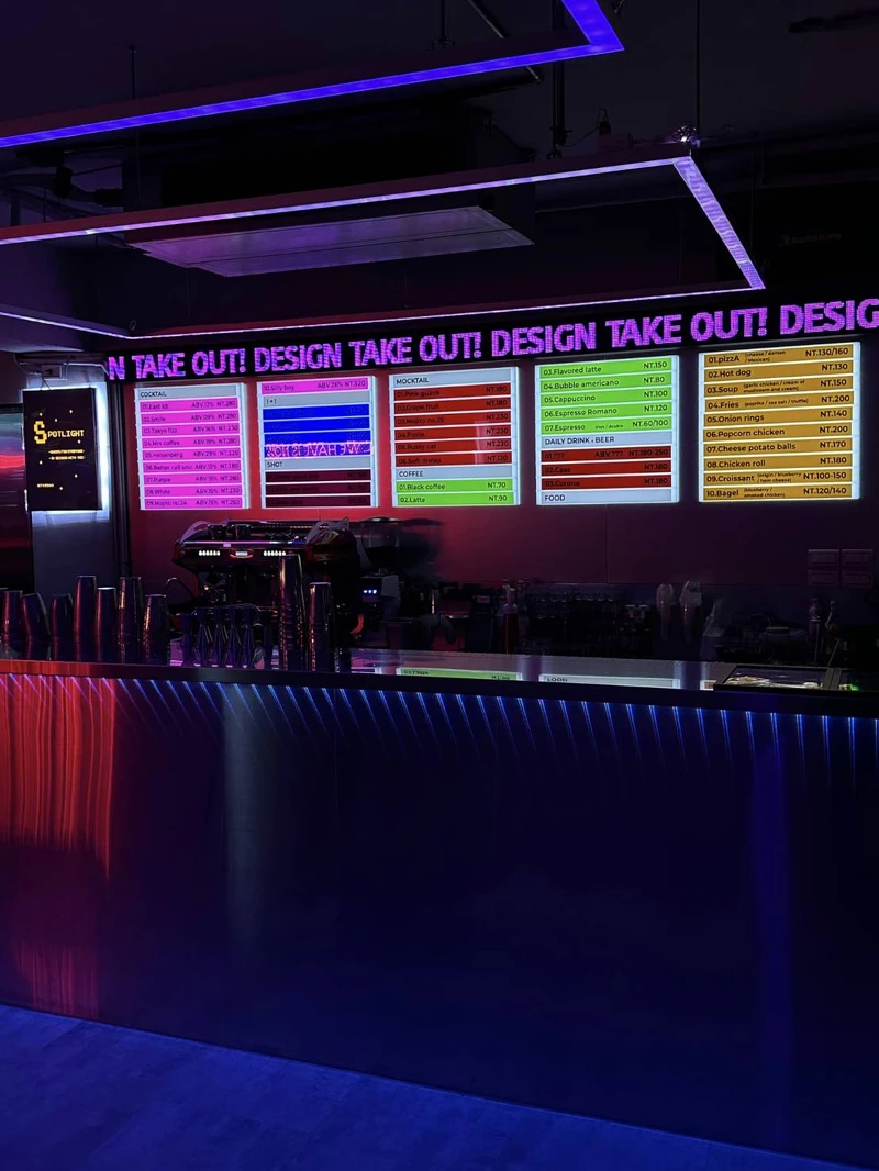 TAKE OUT ! 為台北市東區街頭 Café;Bar;Club 多型態新創品牌,以現代簡約結合賽博龐克 ( Cyberpunk ) 文化風格,24 hr 營業,期許成為具創新且識別性強烈的新地標。店面位於忠孝敦化五號出口步行 14.6 秒,新星團隊重新定義酒吧的風格美學,打破舊有的消費模式,以不熄燈的創意與無壓力的價格,打造一個 2077 的場域。