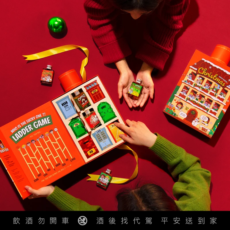 另外,今年搭配上5款小SHOTS,上面的酒標各有不同的意境,有代表「幸運」的耶穌、「愛情的祝福」的Love、「友誼的祝福」的Friend、「有夢最美」的Dream及「驚喜連連」的Lucky。禮盒內隨機放入驚喜小物,敲敲門找出幸運兒,讓大家在把酒言歡的同時會心一笑。