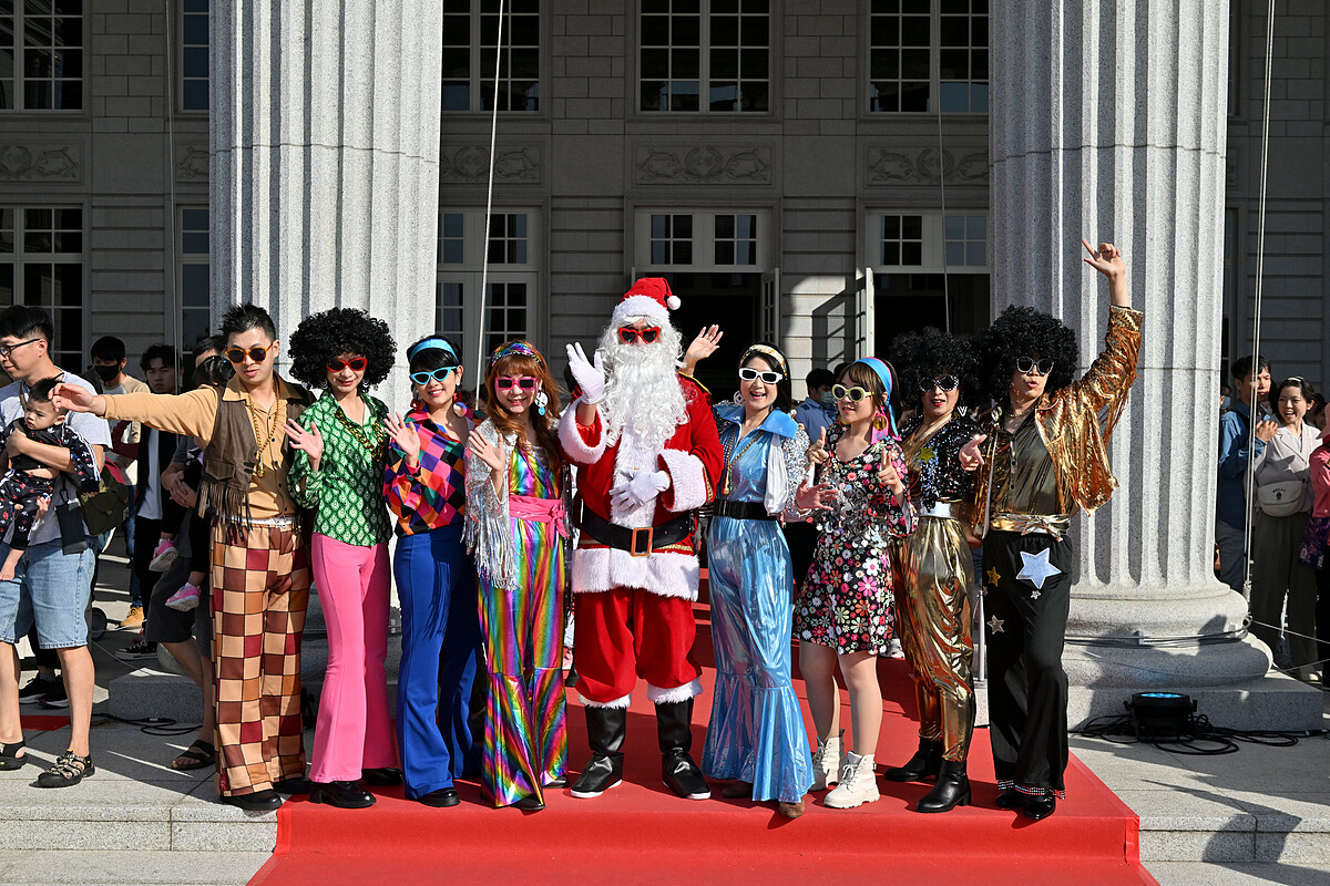 「2023奇美聖誕週末」為呼應年度特展《跳出格子吧!機器X材料X藝術超展開》的懷舊氣氛,精心打造一場充滿70年代DISCO復古風潮的盛會。活動一開始,聖誕老公公與群星隊伍以經典DISCO裝扮亮相,喇叭褲、連身褲等多樣造型,搭配誇張耳環、個性墨鏡、爆炸頭等元素,形成強烈的視覺焦點,讓人彷彿置身70年代的流行現場。在一陣熱鬧開場後,聖誕老公公與群星隊伍接著舉辦見面會,大小朋友爭相排隊,只為與聖誕老公公合影留念。到了晚間,聖誕老公公更邀請大家一起參與聖誕舞會,當現場的螢光棒點亮之際,一片絢麗奪目的光海盡現眼前,整個氣氛達到高潮,每位參與者都陶醉在這個熱情繽紛的聖誕夜裡。