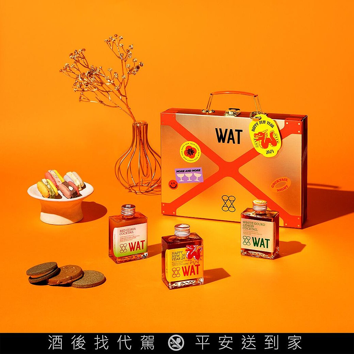 WAT「欣欣向龍 新春禮盒」內含三款瓶裝雞尾酒搭配小茶栽堂明星商品馬卡龍牛軋糖及手工茶餅,其中一款雞尾酒「出水福龍」為龍年新口味,以琴酒、茉莉花茶與紫蘇,帶出怡人草本香氣;新鮮火龍果與檸檬,則提供適宜酸甜滋味,輔以艷紅的酒色,呈現歡慶龍年到來之意。