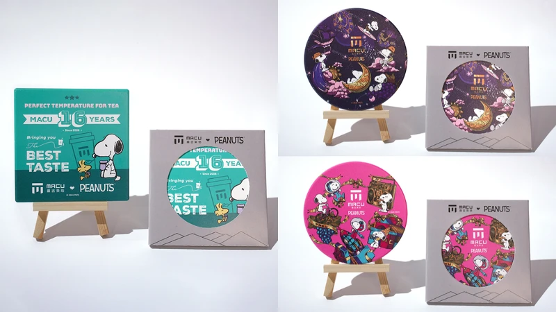 一共有三款,MACU & SNOOPY、紫幻星空與粉夢盛禮。杯墊設計精美,更能為你的日常生活增添一抹樂趣和風格。