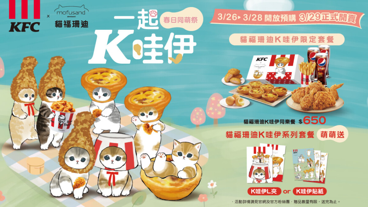 4/30起推出期間限定「媽咪520餐」、「親子同萌餐」,讓你和家人可以一起開心感謝媽咪一整年的辛勞。除此之外,肯德基和貓福珊迪第二波聯名周邊也開跑啦,除了限定餐點包裝外,還有K哇伊系列的帆布袋、鑰匙圈和K哇伊親子頭套超萌限量週邊加價購,貓奴絕對不能錯過!