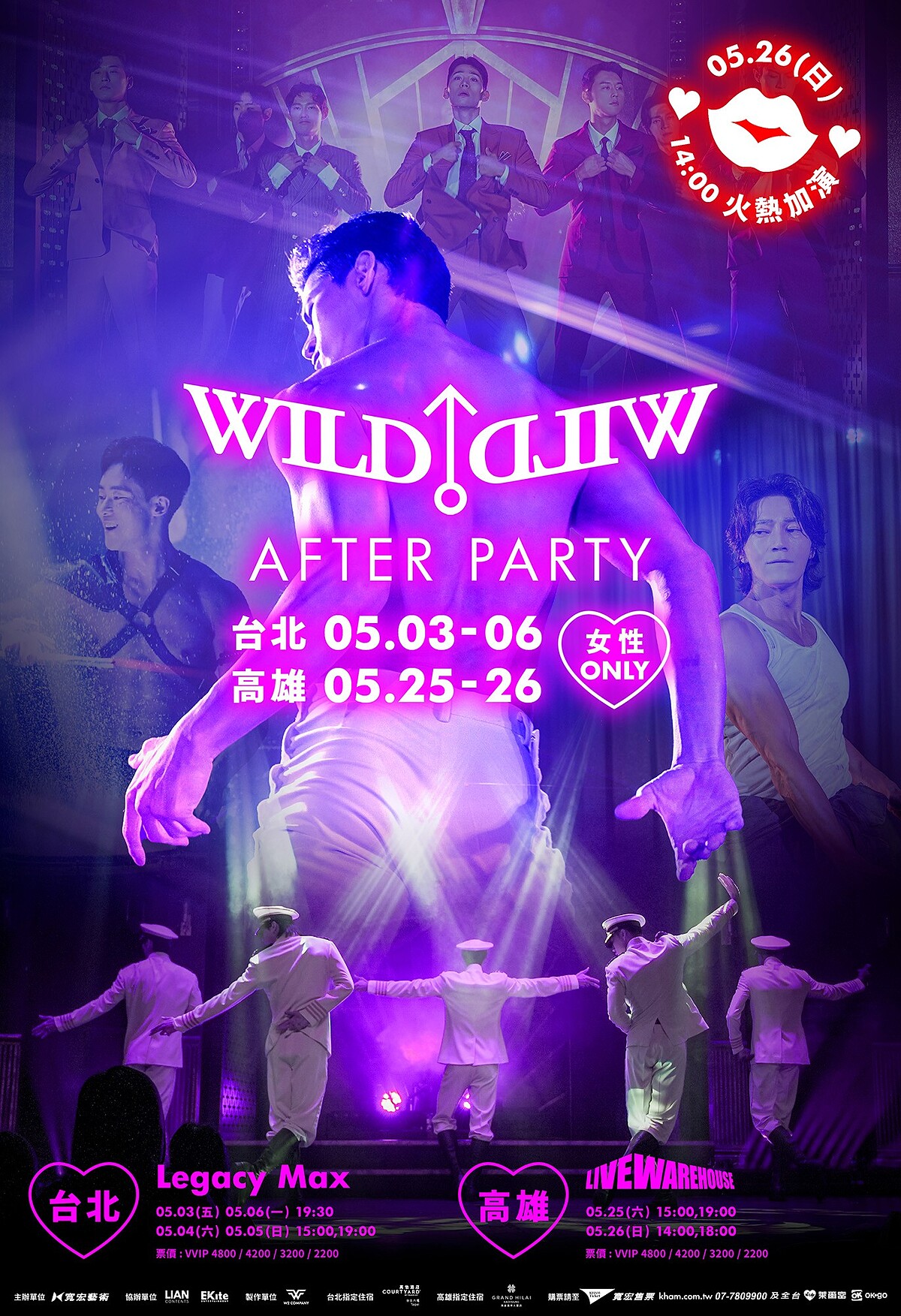 韓國猛男秀《WILD WILD》台北場將從5/3至5/6於台北Legacy Max信義劇場演出,共有6場,而這回首度南下高雄,5/25和5/26一連兩天火熱登場,高雄場則共有4場,演出時長75分鐘。