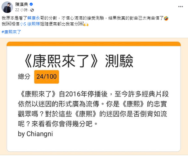 而陳漢典也只得到24分,他表示:我原本是看了蔡康永哥的分數,才信心滿滿的接受測驗,結果我真的對自己太有自信了!」更呼叫小S徐熙娣也來挑戰「我相信小S 徐熙娣姐隨便寫都比我高分」。