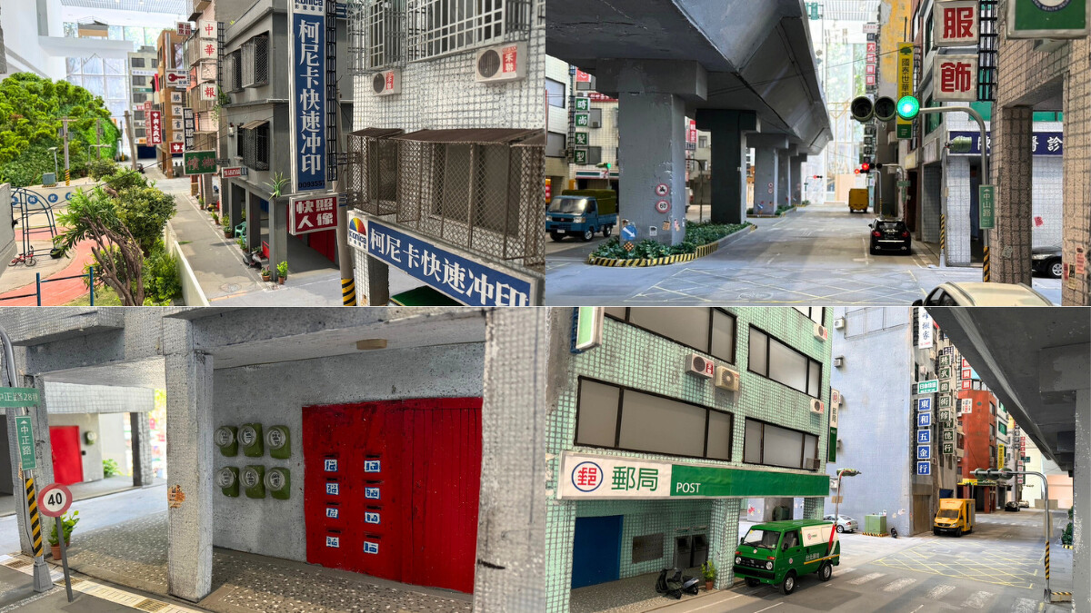 一上到二樓便可見到1:12模型,除了充滿台灣味的招牌外,也能見到高架橋、紅綠燈、學校等日常場景,街上的磁磚、鐵捲門、冷氣機全都縮小了,斑駁的馬路和被雨水侵蝕的痕跡都透過張立人精細的手法表現出來。