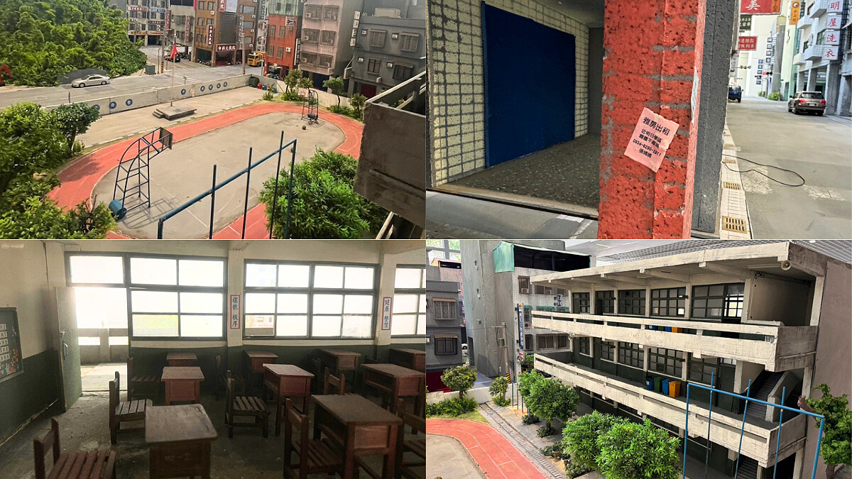 從學校教室的窗戶往裡看,還能見到木頭課桌椅、講台,就連走廊、樓梯、廣播喇叭也都全部還原,操場的籃球架有沒有勾起你的學生時代回憶呢?模型整體細緻程度精到連牆上的廣告傳單都超仿真,沒有認真看的話可能還以為真的是從哪個高樓往下拍的呢。