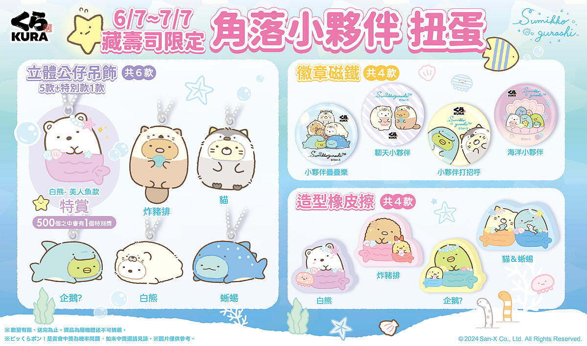 藏壽司 X 角落小夥伴的限定扭蛋6/7開扭!全系列共14款,這次是充滿夏季氣息的海洋系列,角落小夥伴換上一身沁涼勁裝,上演夏季變裝秀,6款「立體公仔吊飾」,包括變裝海獺的「炸豬排」、裝扮成企鵝的「貓」、變身海豚的「企鵝」、化身海豹的「白熊」,還有成為鯨鯊的「蜥蜴」,外加稀有特賞美人魚「白熊」,是不是超級可愛呢?還有4 款夥伴大集合「徽章磁鐵」以及4款美人魚款「造型橡皮擦」。