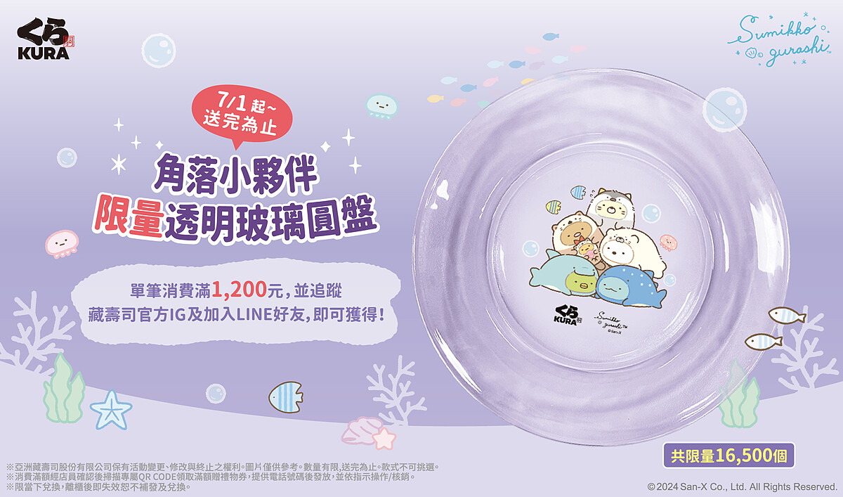 2. 當日單筆消費滿 1,200 元追蹤藏壽司官方 Instagram 以及加入 LINE 好友,至櫃台出示畫面+發票,經店員確認後掃描專屬 QR CODE 領取滿額贈禮物劵,並依指示操作/核銷,成功後即可獲贈「角落小夥伴限量透明玻璃圓盤」乙個