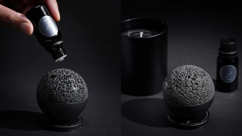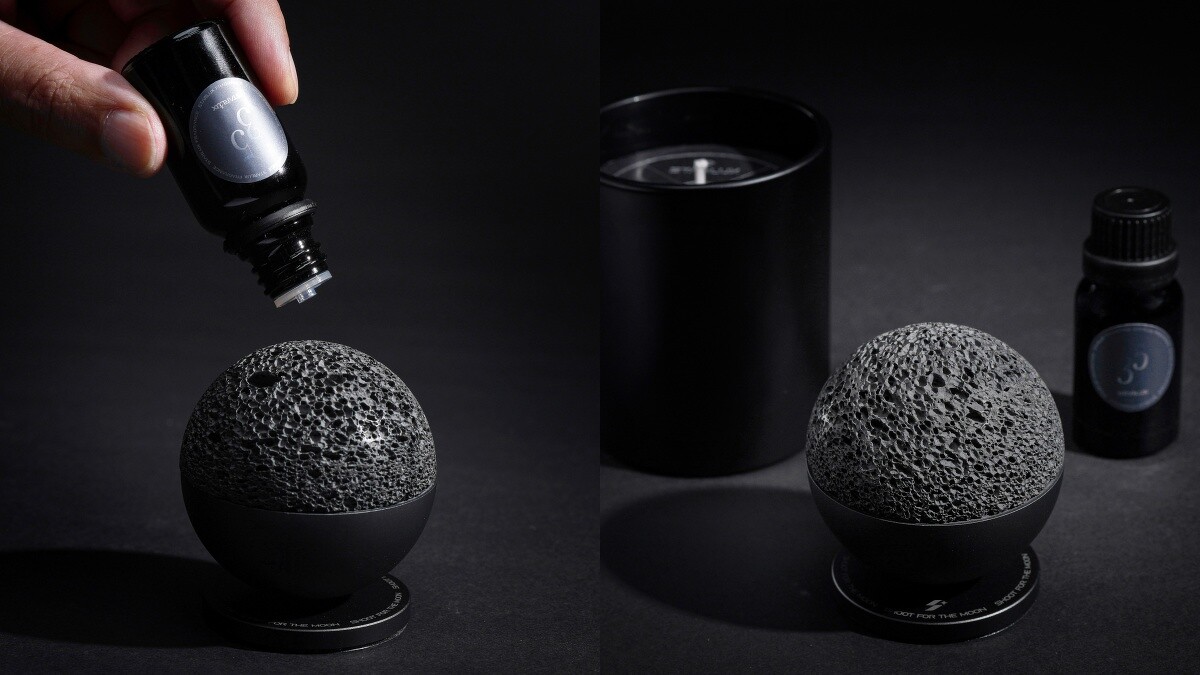 另一大亮點,便是宛如把月球帶回家!一顆由天然火山岩、鋁合金組成的「酷黑熔岩球」,每顆皆擁有獨一二的紋理,立刻為空間營造奇幻星際氛圍!以及有鐫刻「Shoot for the moon」的磁吸式底座,可以把熔岩求放置在上、透過旋轉釋放精油香氣,透過視覺、味覺就能啟程一趟探索之旅!