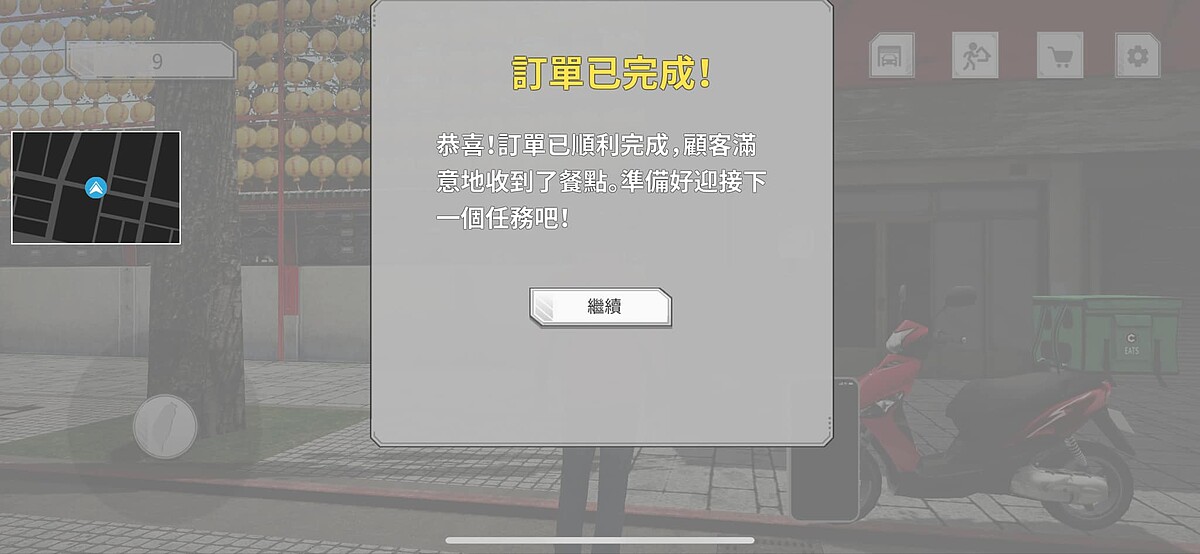 開始接單後左上地圖會顯示店家與點餐民眾所在的方位,螢幕上會有綠色箭頭提醒你位置,完成送完餐點後會跑出「訂單已完成」。