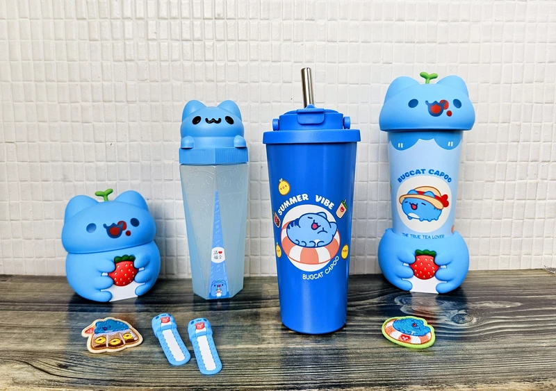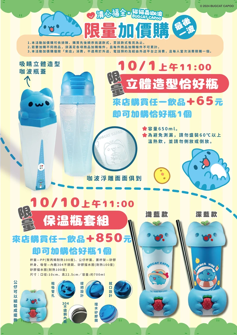 清心福全攜手貓貓蟲咖波,一系列的聯名周邊掀起粉絲收藏潮,繼提袋、別針、書籤和冰塊盒後,最終回的周邊是「立體造型恰好瓶」、「保溫瓶套組」,漂亮的藍色搭配咖波超萌的小臉蛋,光看就覺得心情好好。