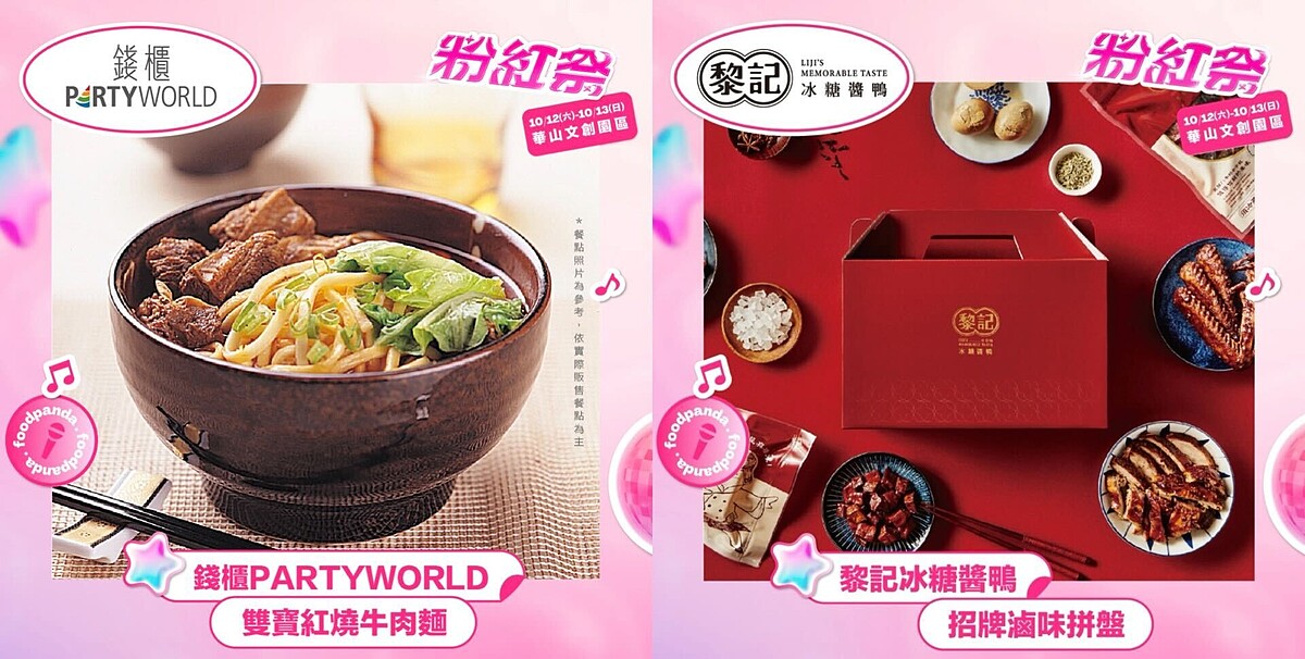 講到foodpanda就一定會聯想到各式各樣的美味料理,粉紅祭以KTV美食為主題,必吃滷味拼盤、炸物、水餃通通沒有缺席。除此之外,還有多間人氣排隊名店,Café from mars、浪漫屋 by 詹記的浪漫大詹、人氣川菜館「老罈香川味兒」旗下餐廳「魚擺擺重慶火鍋」、山海豆花、新村站著吃烤肉等等。其中最讓人期待的就是錢櫃的「雙寶紅燒牛肉麵禮盒」,以及每日限量 100 碗牛肉麵、限量 100 份水餃!