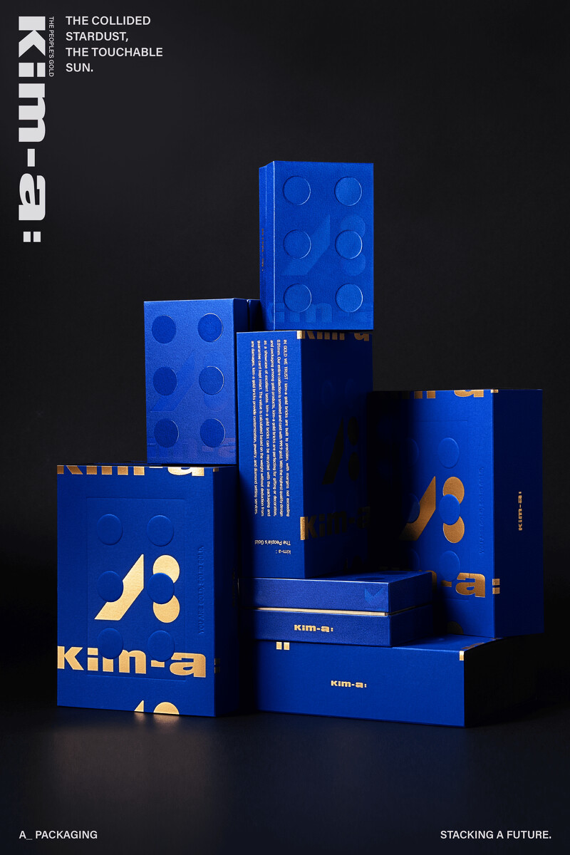 「kim-a:」的品牌識別找來金獎設計師方序中與究方社團隊操刀,以積木的圓形單元體作為標誌元素,並組合成單字「」與「」打造品牌形象,以此概念呈現黃金與積木的可塑性與重組性,加上攝影師蘇益良掌鏡,以「你與黃金最親密的距離」為靈感發想,強烈的視覺效果賦予了黃金商品更高的藝術價值,並呼應「黃金是可觸摸的太陽」之品牌核心。